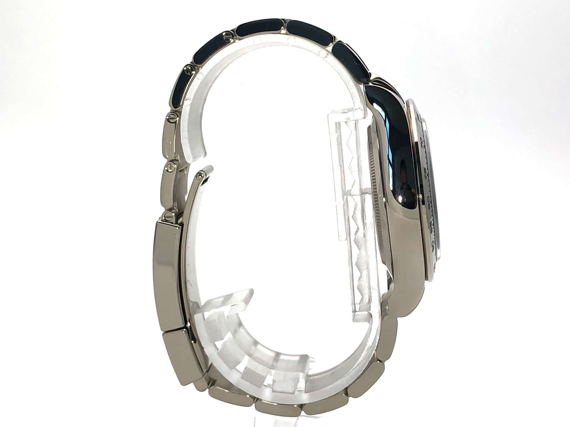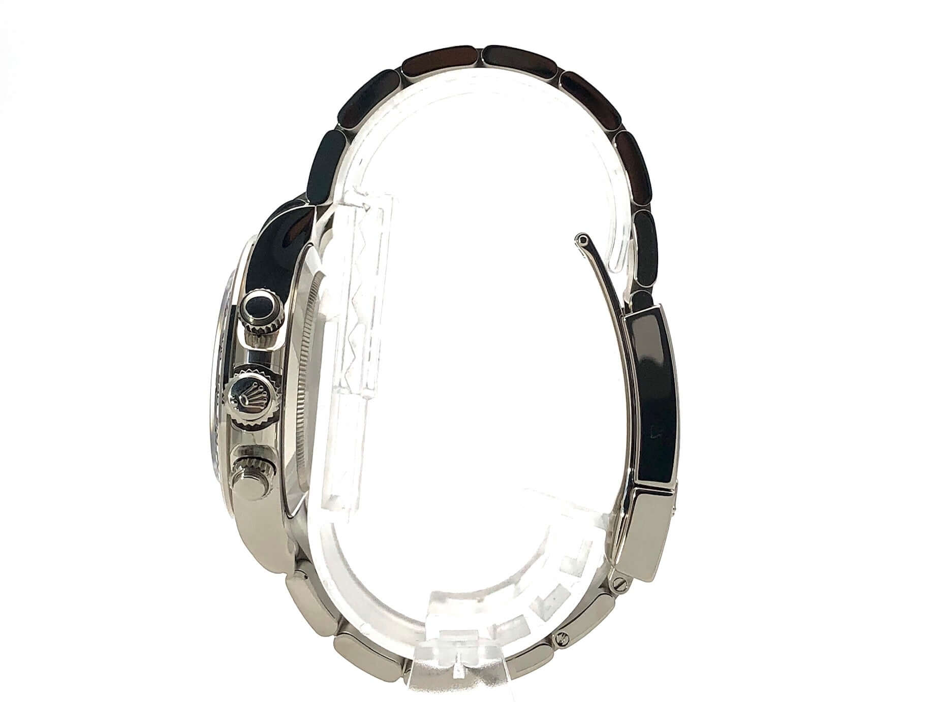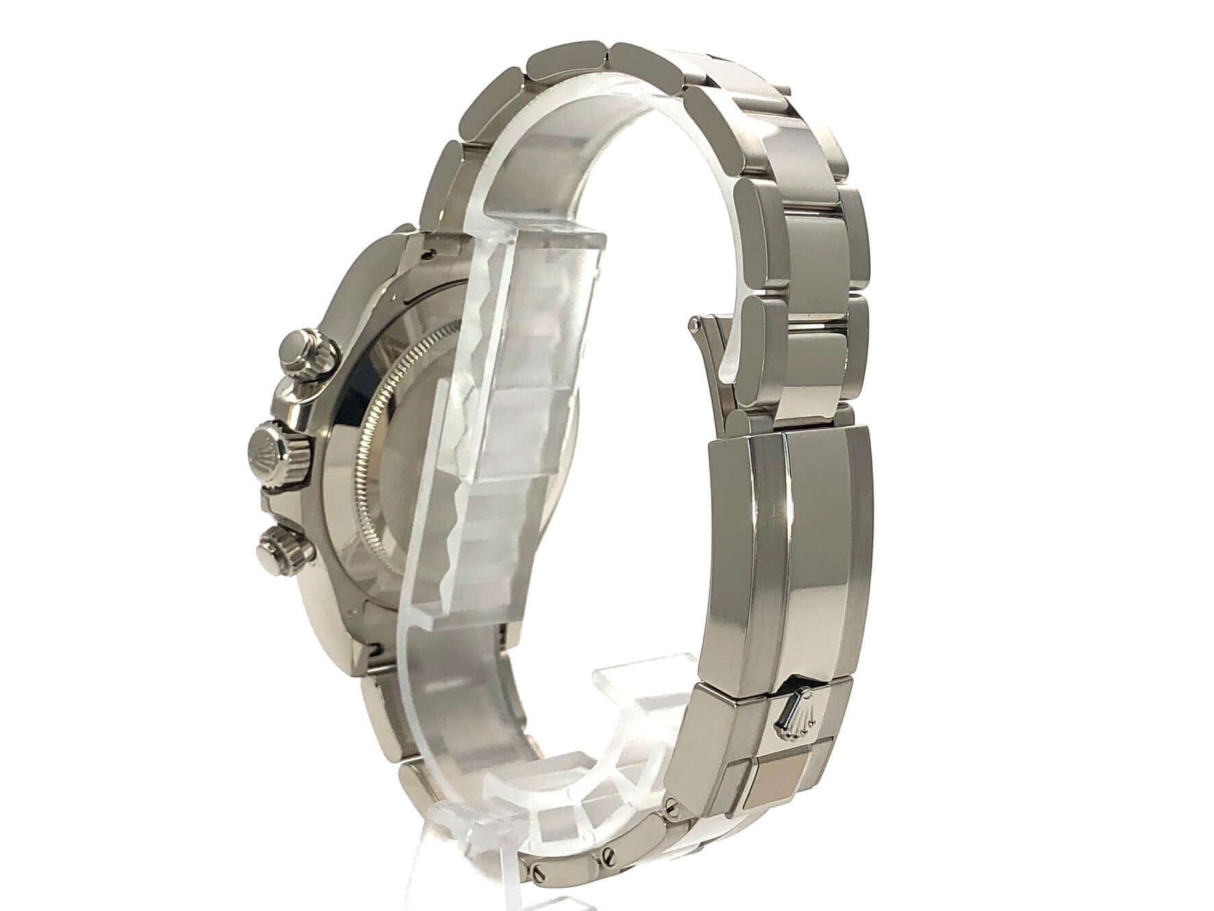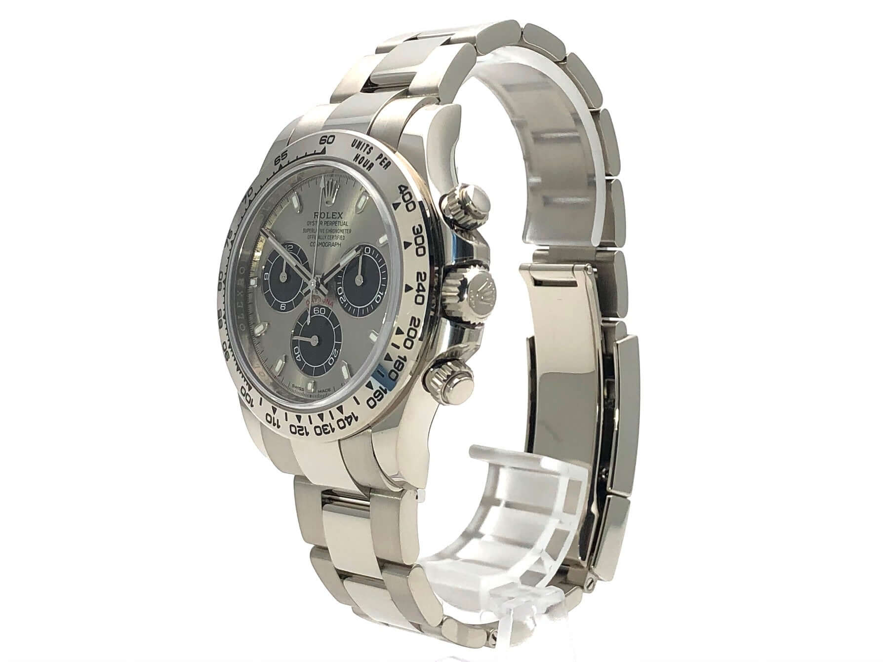 Gehäuse aus 18 kt Weißgold poliert und satiniert, Gehäusedurchmesser 40 mm, Lünette aus 18 kt Weißgold poliert mit Tachymeterskala, Oyster 18 kt Weißgold Armband poliert und satiniert mit Faltschließe, graues Zifferblatt mit Leuchtindizes, Leuchtzeiger, Automatik, Rolex Manufakturkaliber 4130 mit 44 Steine, Schwingung 28.800 A/h, 72 Stunden Gangreserve, Chronometer, kratzfestes Saphirglas, verschraubter Boden aus 18 kt Weißgold, Wasserdicht bis zu 10 bar.
