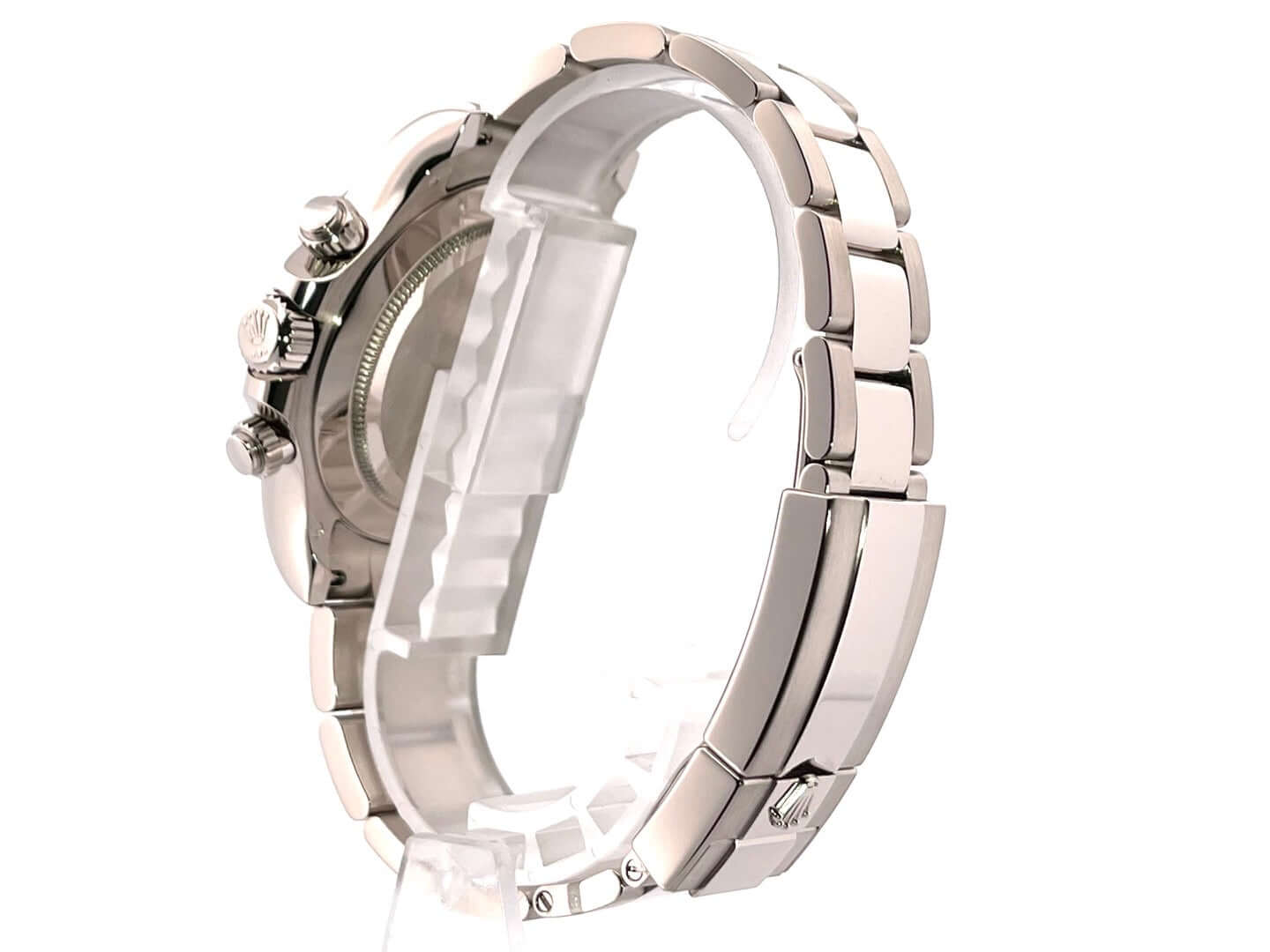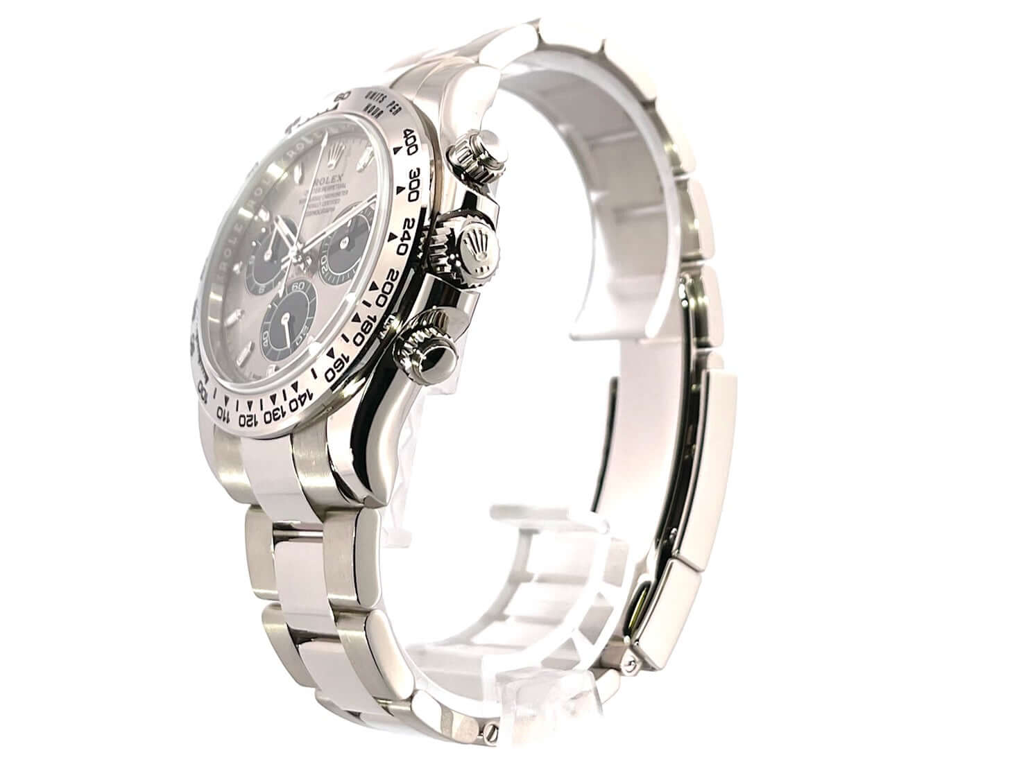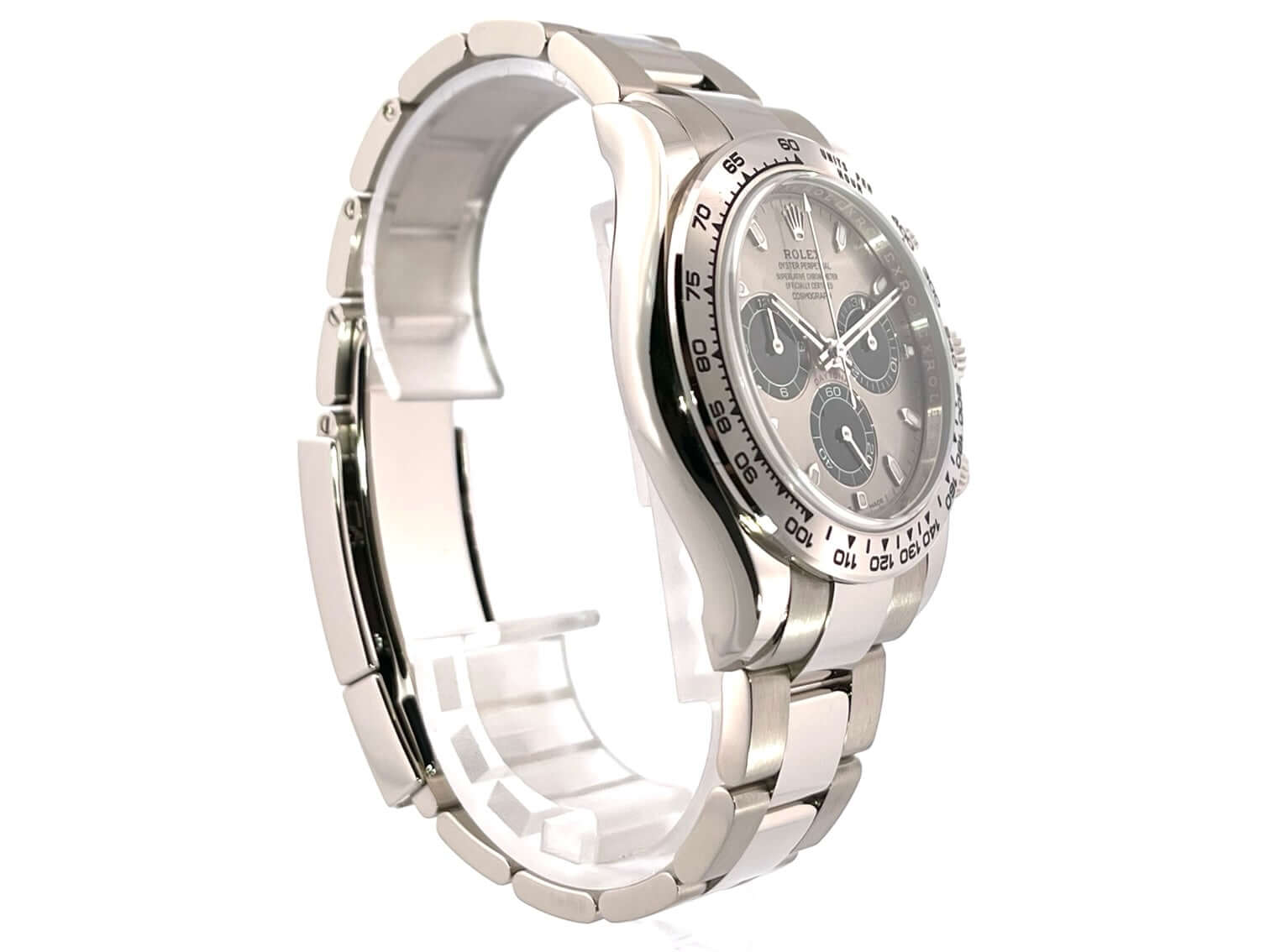 Gehäuse aus 18 kt Weißgold poliert und satiniert, Gehäusedurchmesser 40 mm, Lünette aus 18 kt Weißgold poliert mit Tachymeterskala, Oyster 18 kt Weißgold Armband poliert und satiniert mit Faltschließe, graues Zifferblatt mit Leuchtindizes, Leuchtzeiger, Automatik, Rolex Manufakturkaliber 4130 mit 44 Steine, Schwingung 28.800 A/h, 72 Stunden Gangreserve, Chronometer, kratzfestes Saphirglas, verschraubter Boden aus 18 kt Weißgold, Wasserdicht bis zu 10 bar.