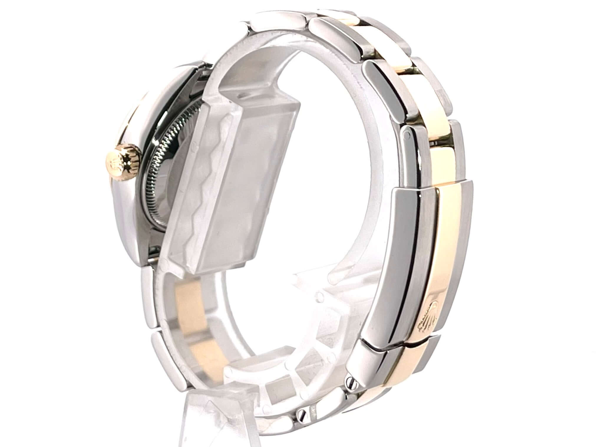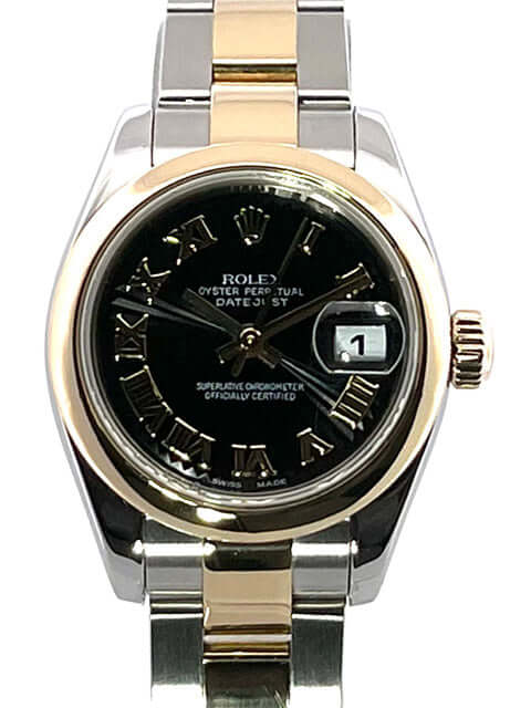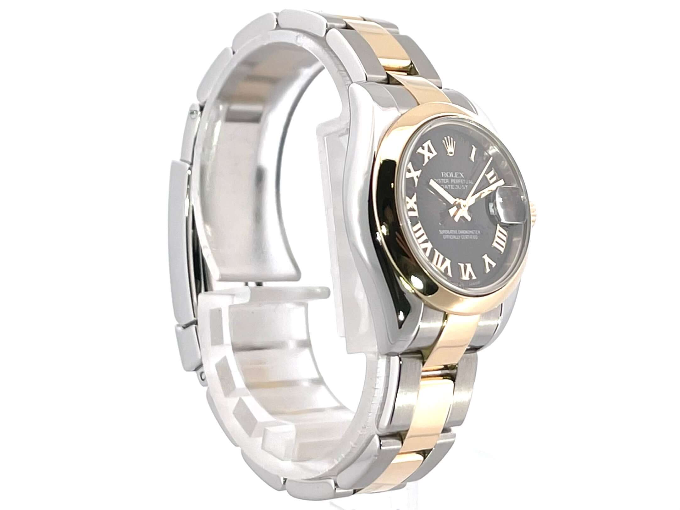 Gehäuse aus Edelstahl poliert und satiniert, Gehäusedurchmesser 26 mm, glatte und polierte Lünette aus 18 kt Gelbgold, Oyster Edelstahl / 18 kt Gelbgold Armband poliert und satiniert mit Faltschließe, schwarzes Zifferblatt mit aufgesetzten goldenen römischen Ziffern, Automatikwerk, Rolex Manufakturkaliber 2235 mit 31 Steine, 28.800 A/h, Gangreserve ca. 48 Stunden, Chronometer, Datumsanzeige, kratzfestes Saphirglas, verschraubte Krone aus 18 kt Gelbgold, Edelstahlboden verschraubt, Wasserdicht bis zu 10 bar.
