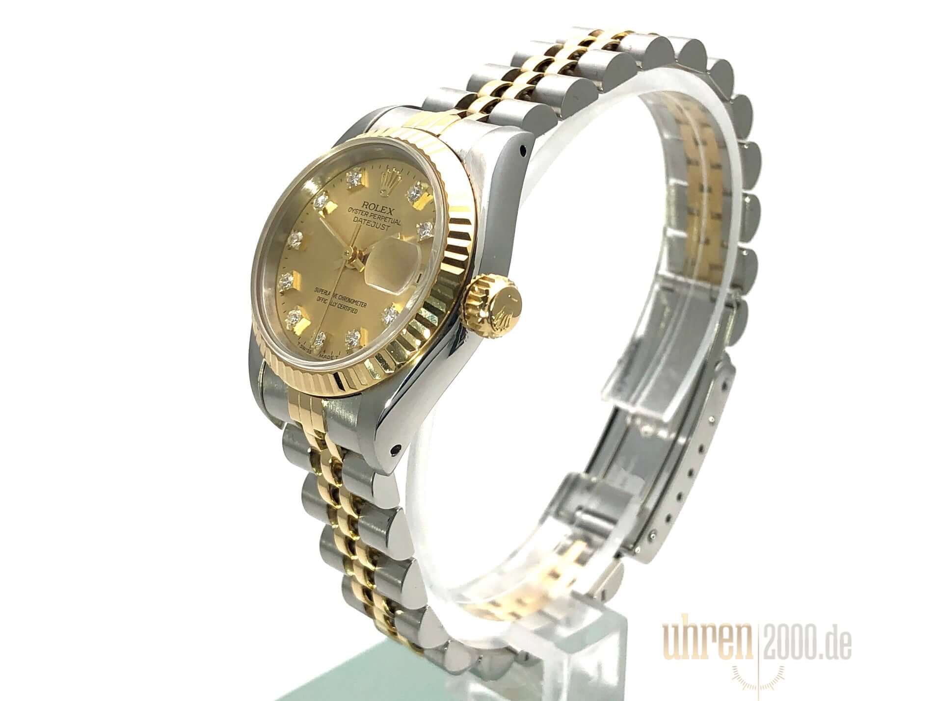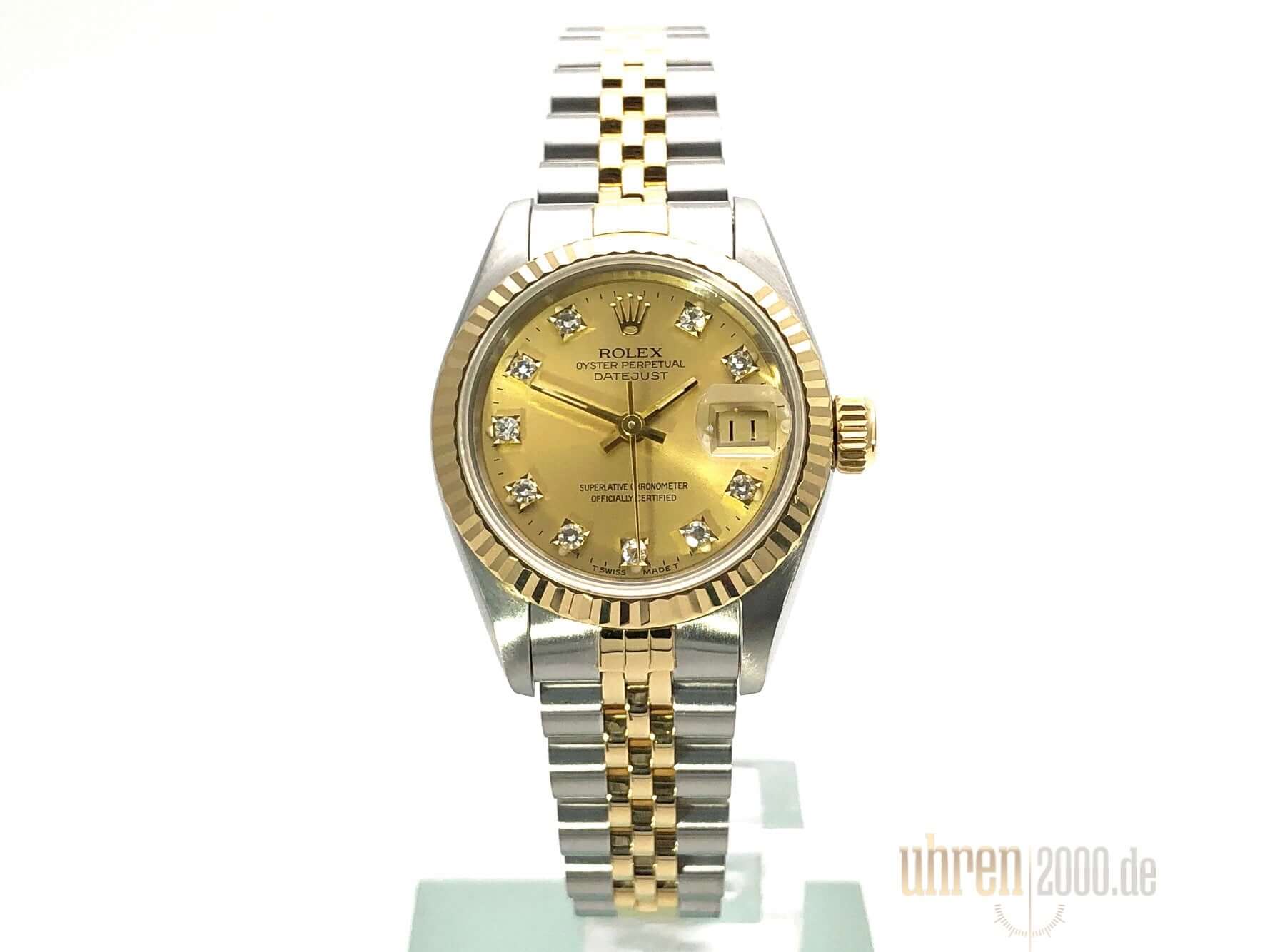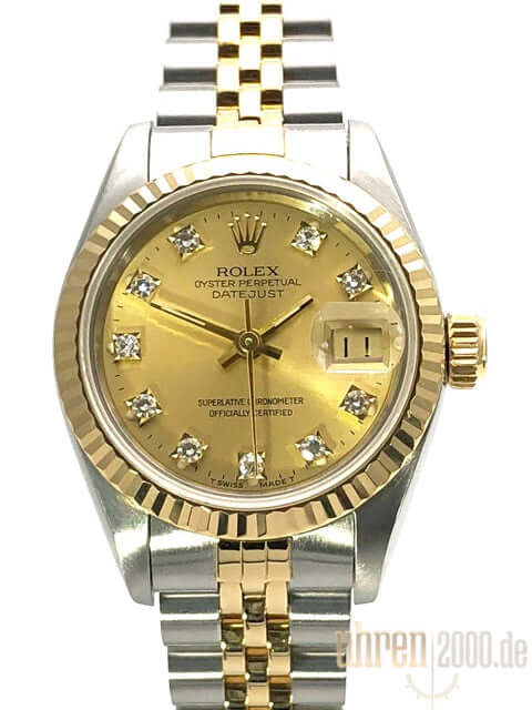 Gehäuse aus Edelstahl poliert und satiniert, Durchmesser 26 mm, Lünette aus 18 kt Gelbgold geriffelt, Jubile Edelstahl / 18 kt Gelbgold Armband poliert und satiniert mit Faltschließe, Champagnerfarbenes Zifferblatt mit aufgesetzten Diamanten, goldene Zeiger, Automatikwerk, Rolex Manufakturkaliber 2130 mit 29 Steine, Schwingung 28.800 A/h, Datumsanzeige, Chronometer, kratzfestes Saphirglas, Krone aus 18 kt Gelbgold verschraubbar, verschraubter Edelstahlboden, Wasserdicht bis 10 bar.