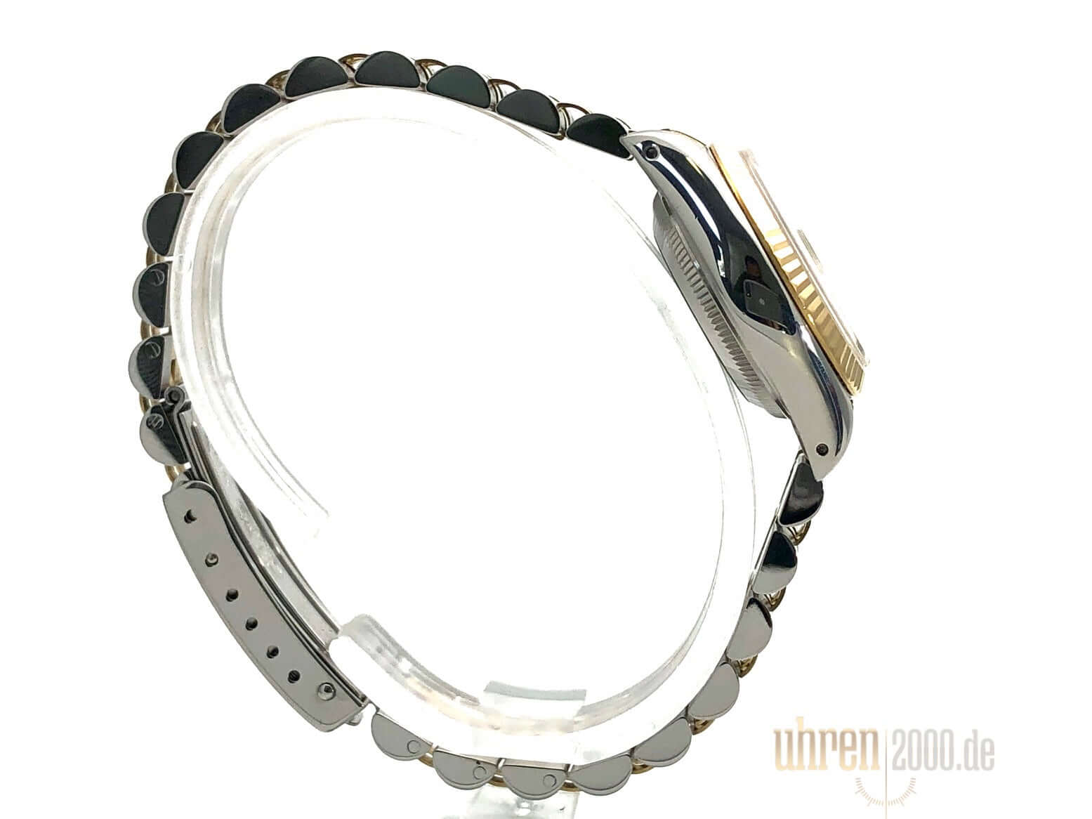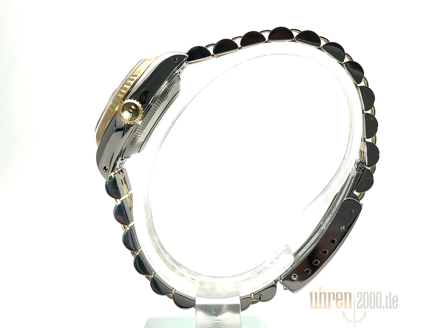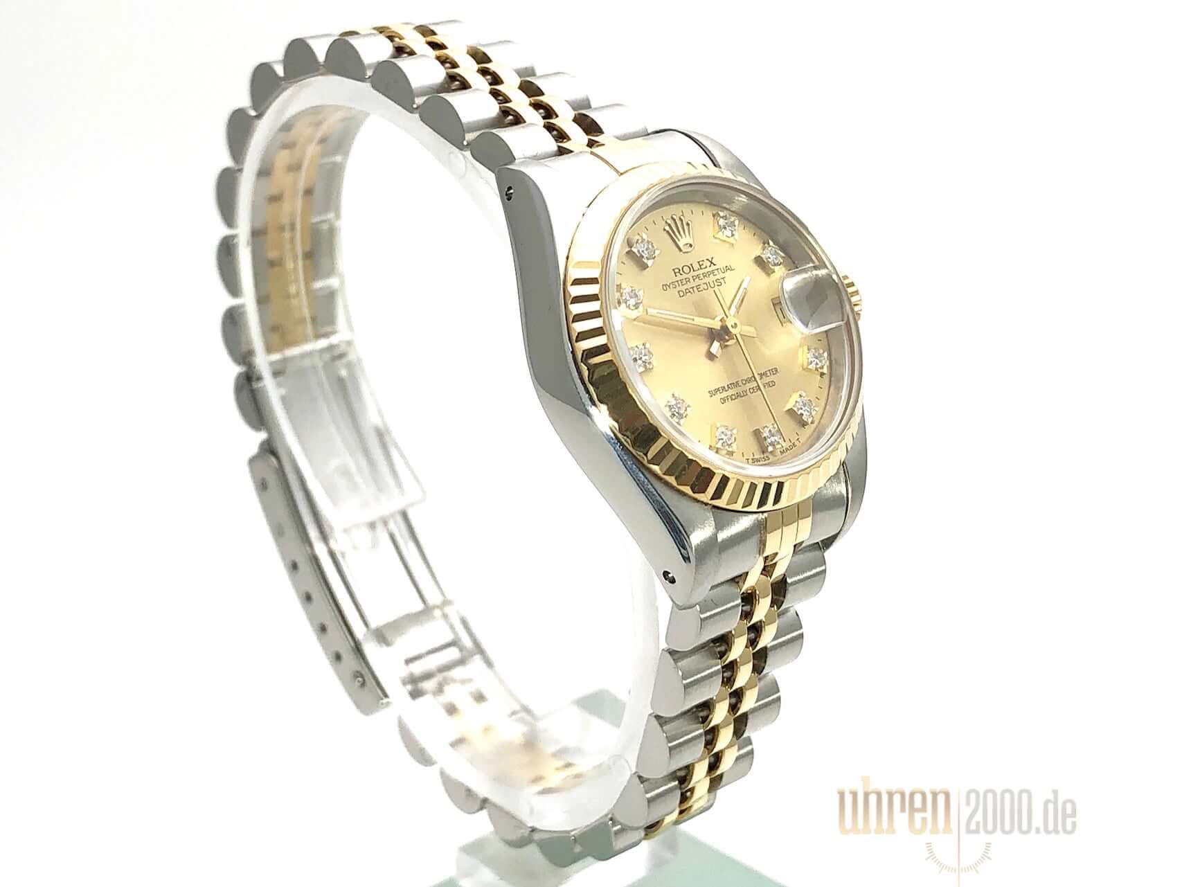 Gehäuse aus Edelstahl poliert und satiniert, Durchmesser 26 mm, Lünette aus 18 kt Gelbgold geriffelt, Jubile Edelstahl / 18 kt Gelbgold Armband poliert und satiniert mit Faltschließe, Champagnerfarbenes Zifferblatt mit aufgesetzten Diamanten, goldene Zeiger, Automatikwerk, Rolex Manufakturkaliber 2130 mit 29 Steine, Schwingung 28.800 A/h, Datumsanzeige, Chronometer, kratzfestes Saphirglas, Krone aus 18 kt Gelbgold verschraubbar, verschraubter Edelstahlboden, Wasserdicht bis 10 bar.