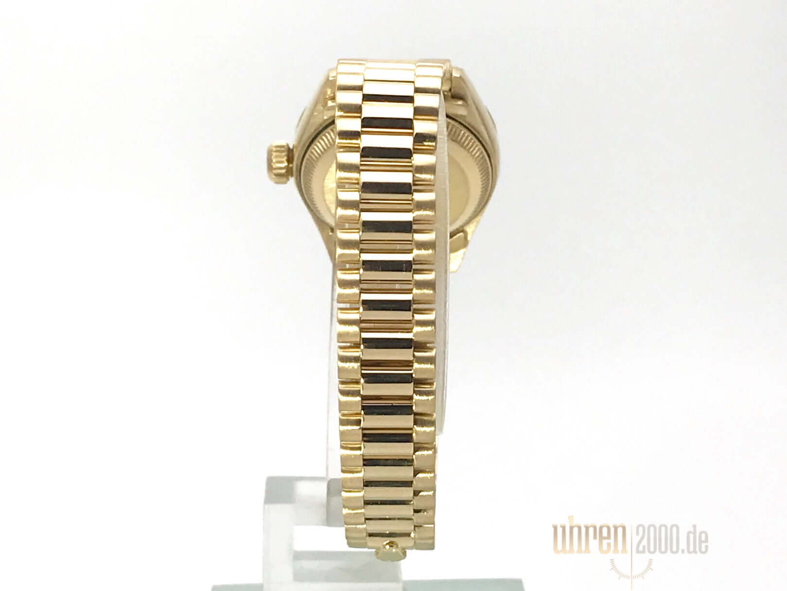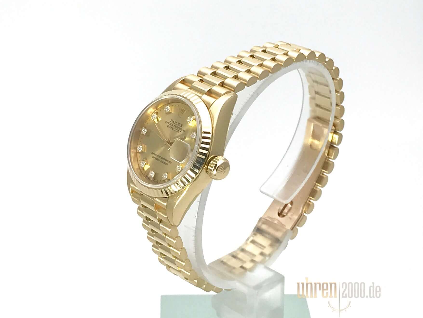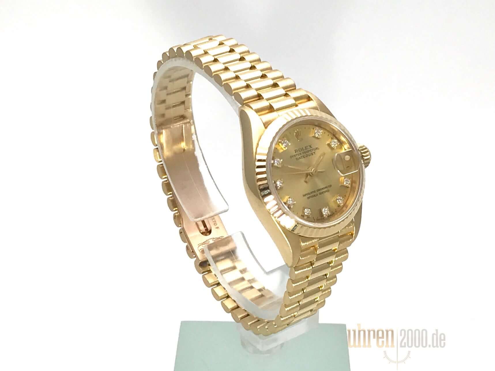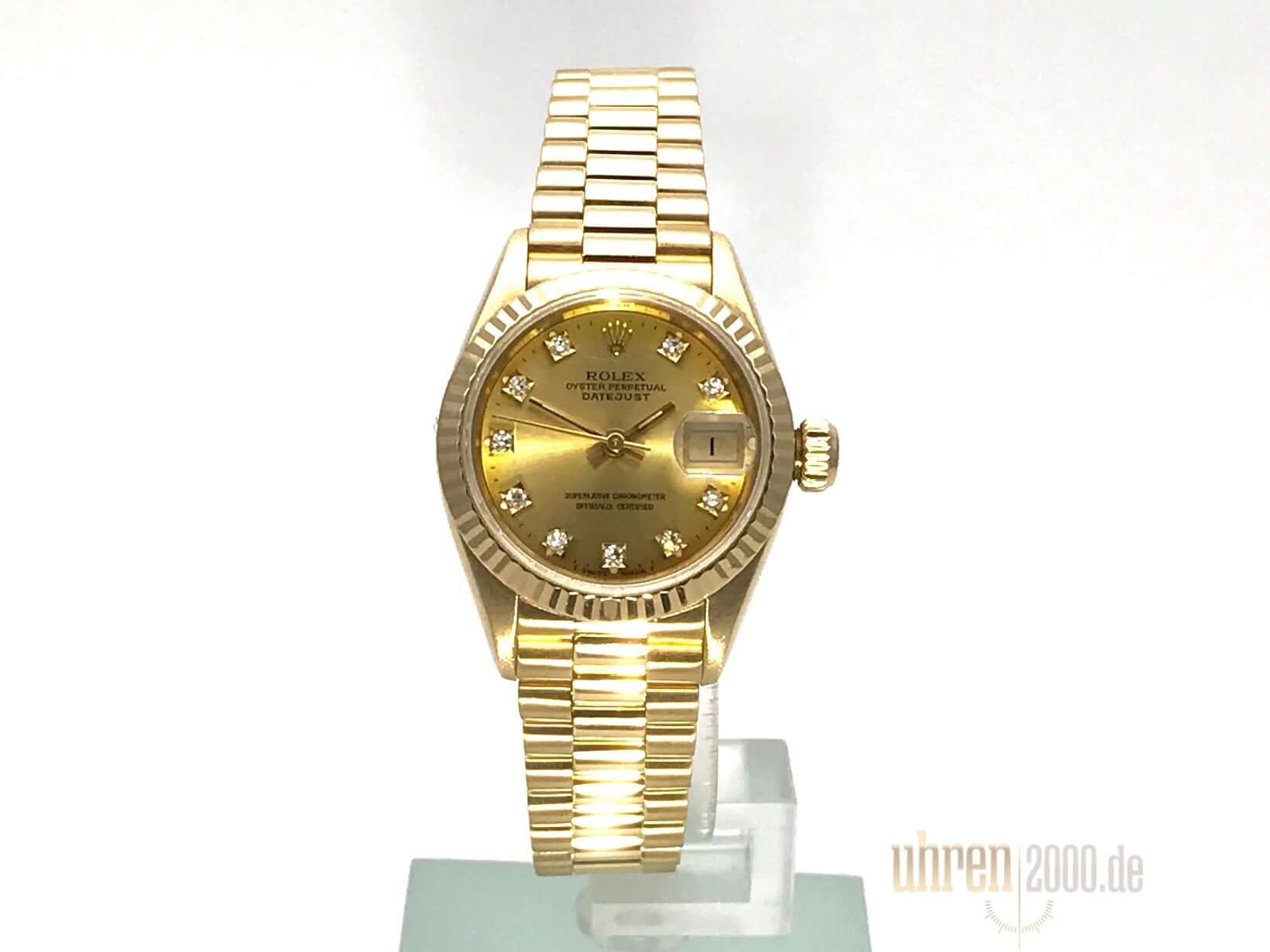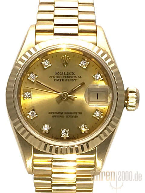Gehäuse aus Gelbgold poliert und satiniert, Durchmesser 26 mm, Lünette aus 18 kt Gelbgold geriffelt, 18 kt Gelbgold Armband poliert und satiniert mit Faltschließe, Champagnerfarbenes Zifferblatt mit aufgesetzten Diamanten, goldene Zeiger, Automatikwerk, Chronometer, Rolex Manufakturkaliber 2130 mit 29 Steine, Schwingung 28.800 A/h, Datumsanzeige, kratzfestes Saphirglas, Krone aus 18 kt Gelbgold verschraubbar, verschraubter Gelbgoldboden, Wasserdicht bis 10 bar.