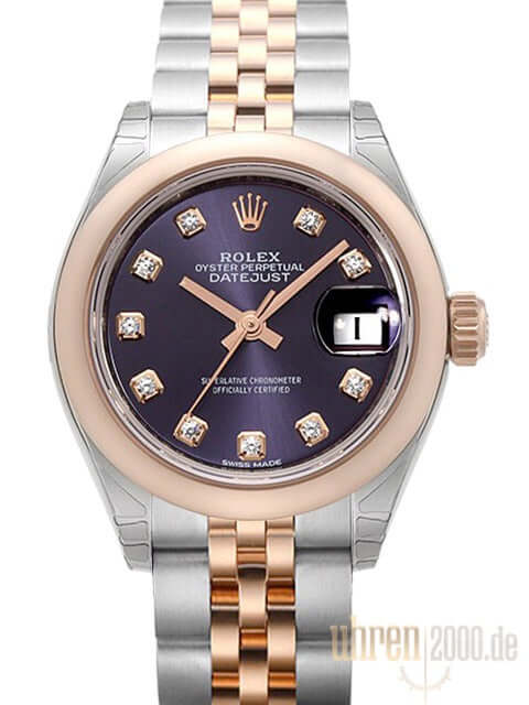 Gehäuse aus Edelstahl poliert und satiniert, Gehäusedurchmesser 28 mm, glatte und polierte Lünette aus 18 kt Everose‑Gold, Jubile Edelstahl / 18 kt Everose‑Gold Armband poliert und satiniert mit Faltschließe, Aubergine Diamantzifferblatt, Automatikwerk, Rolex Manufakturkaliber 2236 mit 31 Steine, 28.800 A/h, Gangreserve ca. 55 Stunden, Datumsanzeige, Chronometer, kratzfestes Saphirglas, verschraubte Krone aus 18 kt Everose‑Gold, Edelstahlboden verschraubt, Wasserdicht bis zu 10 bar.