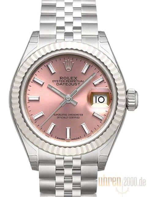 Gehäuse aus Edelstahl poliert und satiniert, Gehäusedurchmesser 28 mm, Lünette aus 18 kt Weißgold geriffelt, Jubile Edelstahlband poliert und satiniert mit Faltschließe, Pinkfarbenes Zifferblatt mit aufgesetzten Leuchtindizes, Leuchtzeiger, Automatik, Rolex Manufakturkaliber 2236, Datum, Chronometer, Saphirglas, Krone verschraubt, Edelstahlboden verschraubt, Wasserdicht bis 10 bar.