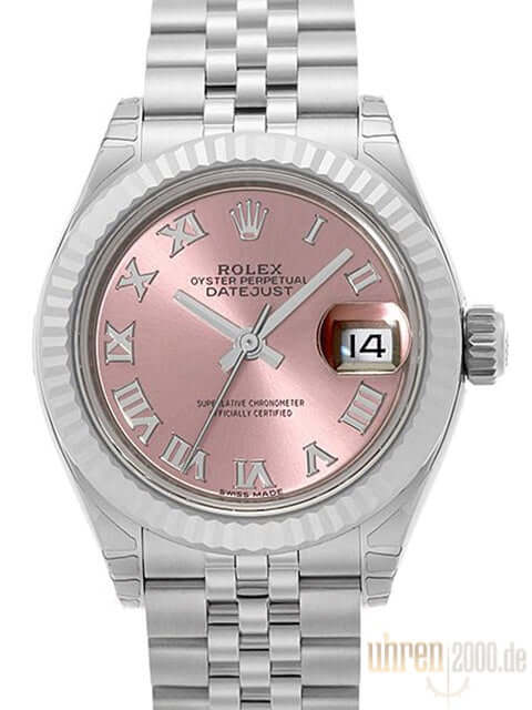 Gehäuse aus Edelstahl poliert und satiniert, Gehäusedurchmesser 28 mm, Lünette aus 18 kt Weißgold geriffelt, Jubile Edelstahlband poliert und satiniert mit Faltschließe, Pinkfarbenes Zifferblatt mit aufgesetzten römischen Ziffern, Automatik, Rolex Manufakturkaliber 2236, Datum, Chronometer, Saphirglas, Krone verschraubt, Edelstahlboden verschraubt, Wasserdicht bis 10 bar.