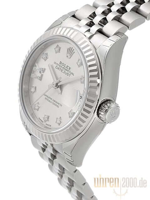 Gehäuse aus Edelstahl poliert und satiniert, Gehäusedurchmesser 28 mm, Lünette aus 18 kt Weißgold geriffelt, Jubile Edelstahlband poliert und satiniert mit Faltschließe, silberfarbenes Zifferblatt mit aufgesetzten Diamanten, Automatik, Rolex Manufakturkaliber 2236, Datum, Chronometer, Saphirglas, Krone verschraubt, Edelstahlboden verschraubt, Wasserdicht bis 10 bar.