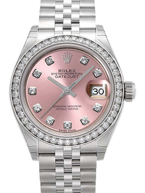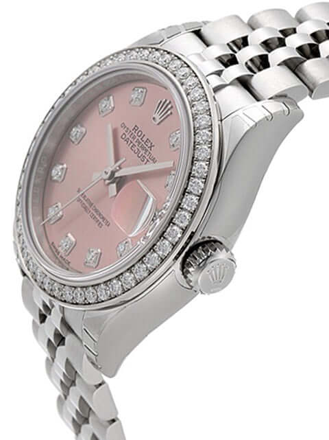 Gehäuse aus Edelstahl poliert und satiniert, Gehäusedurchmesser 28 mm, Lünette aus 18 kt Weißgold mit Diamanten, Jubile Edelstahlband poliert und satiniert mit Faltschließe, Pinkfarbenes Diamantzifferblatt, Automatik, Rolex Manufakturkaliber 2236, Datum, Chronometer, Saphirglas, Krone verschraubt, Edelstahlboden verschraubt, Wasserdicht bis 10 bar.