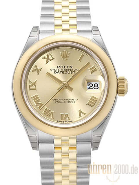 Gehäuse aus Edelstahl poliert und satiniert, Gehäusedurchmesser 28 mm, glatte und polierte Lünette aus 18 kt Gelbgold, Jubile Edelstahl / 18 kt Gelbgold Armband poliert und satiniert mit Faltschließe, Champagnerfarbenes Zifferblatt mit aufgesetzten römischen Ziffern, Automatikwerk, Rolex Manufakturkaliber 2236 mit 31 Steine, 28.800 A/h, Gangreserve ca. 55 Stunden, Datumsanzeige, Chronometer, kratzfestes Saphirglas, verschraubte Krone aus 18 kt Gelbgold, Edelstahlboden verschraubt, Wasserdicht bis zu 10 bar.