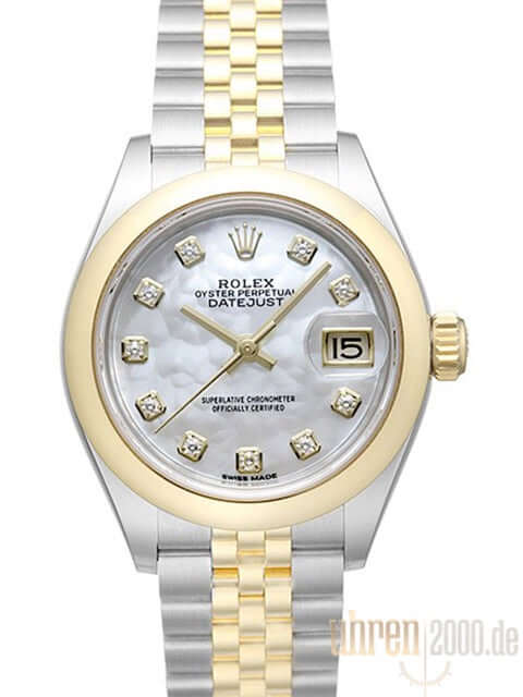 Gehäuse aus Edelstahl poliert und satiniert, Gehäusedurchmesser 28 mm, glatte und polierte Lünette aus 18 kt Gelbgold, Jubile Edelstahl / 18 kt Gelbgold Armband poliert und satiniert mit Faltschließe, Perlmutt Zifferblatt mit Diamanten besetzt, Automatikwerk, Rolex Manufakturkaliber 2236 mit 31 Steine, 28.800 A/h, Gangreserve ca. 55 Stunden, Datumsanzeige, Chronometer, kratzfestes Saphirglas, verschraubte Krone aus 18 kt Gelbgold, Edelstahlboden verschraubt, Wasserdicht bis zu 10 bar.