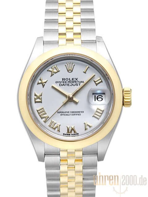 Gehäuse aus Edelstahl poliert und satiniert, Gehäusedurchmesser 28 mm, glatte und polierte Lünette aus 18 kt Gelbgold, Jubile Edelstahl / 18 kt Gelbgold Armband poliert und satiniert mit Faltschließe, weißes Zifferblatt mit aufgesetzten römischen Ziffern, Automatikwerk, Rolex Manufakturkaliber 2236 mit 31 Steine, 28.800 A/h, Gangreserve ca. 55 Stunden, Datumsanzeige, Chronometer, kratzfestes Saphirglas, verschraubte Krone aus 18 kt Gelbgold, Edelstahlboden verschraubt, Wasserdicht bis zu 10 bar.