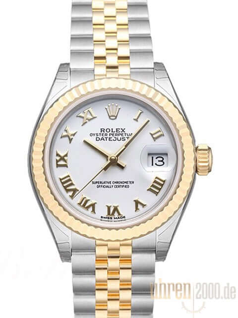 Gehäuse aus Edelstahl / Gelbgold poliert und satiniert, Gehäusedurchmesser 28 mm, geriffelte Lünette aus 18 kt Gelbgold, weißes Zifferblatt mit aufgesetzten goldenen römischen Ziffern, Jubile Edelstahl / 18 kt Gelbgold Armband poliert und satiniert mit Faltschließe, Automatikwerk, Rolex Manufakturkaliber 2236 mit 31 Steine, 28.800 A/h, Gangreserve ca. 55 Stunden, Datumsanzeige, Chronometer, kratzfestes Saphirglas, verschraubte Krone aus 18 kt Gelbgold, Edelstahlboden verschraubt, Wasserdicht bis zu 10 bar.