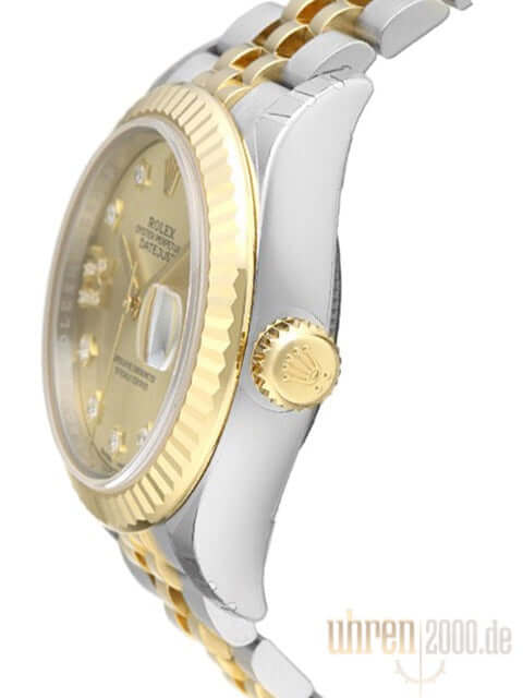 Gehäuse aus Edelstahl poliert und satiniert, Gehäusedurchmesser 28 mm, geriffelte Lünette aus 18 kt Gelbgold, Jubile Edelstahl / 18 kt Gelbgold Armband poliert und satiniert mit Faltschließe, silberfarbenes Diamantzifferblatt mit Diamanten in der Römisch IX, Automatikwerk, Rolex Manufakturkaliber 2236 mit 31 Steine, 28.800 A/h, Gangreserve ca. 55 Stunden, Datumsanzeige, Chronometer, kratzfestes Saphirglas, verschraubte Krone aus 18 kt Gelbgold, Edelstahlboden verschraubt, Wasserdicht bis zu 10 bar.