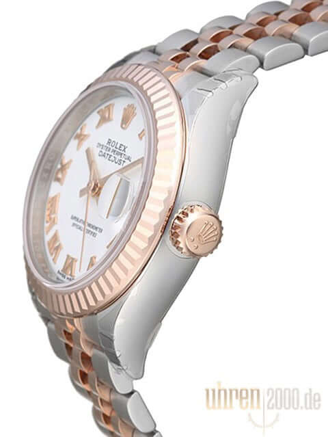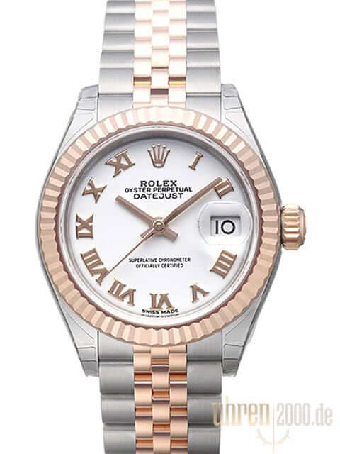 Gehäuse aus Edelstahl poliert und satiniert, Gehäusedurchmesser 28 mm, geriffelte Lünette aus 18 kt Everose‑Gold, Jubile Edelstahl / 18 kt Everose‑Gold Armband poliert und satiniert mit Faltschließe, weißes Zifferblatt mit aufgesetzten römischen Ziffern, Automatikwerk, Rolex Manufakturkaliber 2236 mit 31 Steine, 28.800 A/h, Gangreserve ca. 55 Stunden, Chronometer, Datumsanzeige, kratzfestes Saphirglas, verschraubte Krone aus 18 kt Everose‑Gold, Edelstahlboden verschraubt, Wasserdicht bis zu 10 bar.
