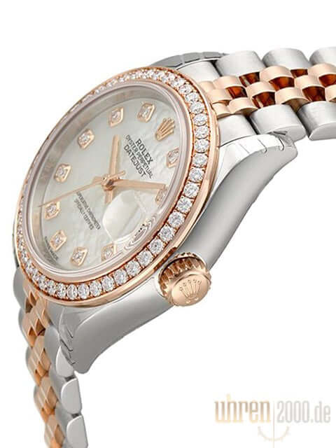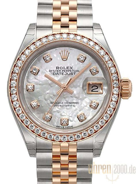 Gehäuse aus Edelstahl poliert und satiniert, Gehäusedurchmesser 28 mm, Lünette aus 18 kt Everose‑Gold mit Diamanten, Jubile Edelstahl / 18 kt Everose‑Gold Armband poliert und satiniert mit Faltschließe, Perlmutt Diamantzifferblatt, Automatikwerk, Rolex Manufakturkaliber 2236 mit 31 Steine, 28.800 A/h, Gangreserve ca. 55 Stunden, Datumsanzeige, Chronometer, kratzfestes Saphirglas, verschraubte Krone aus 18 kt Everose‑Gold, Edelstahlboden verschraubt, Wasserdicht bis zu 10 bar.