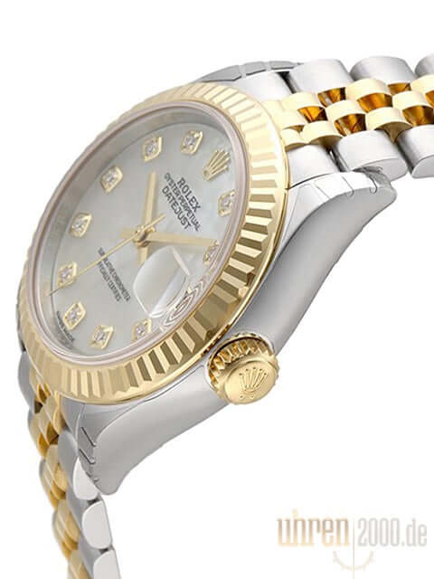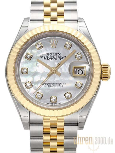 Gehäuse aus Edelstahl poliert und satiniert, Gehäusedurchmesser 28 mm, geriffelte Lünette aus 18 kt Gelbgold, Jubile Edelstahl / 18 kt Gelbgold Armband poliert und satiniert mit Faltschließe, Perlmutt Diamantzifferblatt, Automatikwerk, Rolex Manufakturkaliber 2236 mit 31 Steine, 28.800 A/h, Gangreserve ca. 55 Stunden, Datumsanzeige, Chronometer, kratzfestes Saphirglas, verschraubte Krone aus 18 kt Gelbgold, Edelstahlboden verschraubt, Wasserdicht bis zu 10 bar.