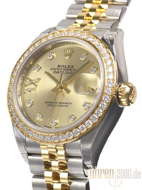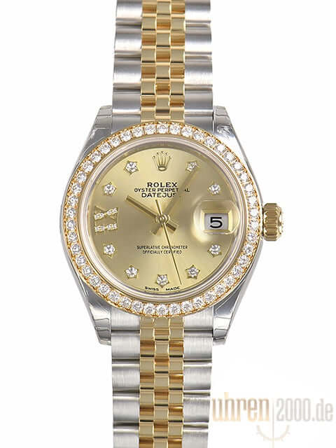 Gehäuse aus Edelstahl poliert und satiniert, Gehäusedurchmesser 28 mm, Lünette aus 18 kt Gelbgold mit Diamanten, Jubile Edelstahl / 18 kt Gelbgold Armband poliert und satiniert mit Faltschließe, Champagnerfarbenes Diamantzifferblatt mit Diamanten in der Römisch IX, Automatikwerk, Rolex Manufakturkaliber 2236 mit 31 Steine, 28.800 A/h, Gangreserve ca. 55 Stunden, Datumsanzeige, Chronometer, kratzfestes Saphirglas, verschraubte Krone aus 18 kt Gelbgold, Edelstahlboden verschraubt, Wasserdicht bis zu 10 bar.