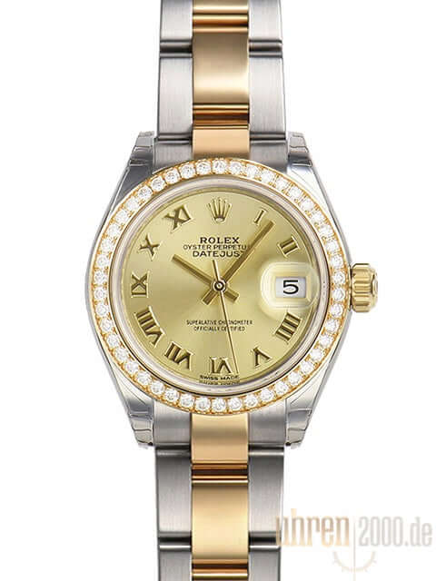 Gehäuse aus Edelstahl poliert und satiniert, Gehäusedurchmesser 28 mm, Lünette aus 18 kt Gelbgold mit Diamanten, Oyster Edelstahl / 18 kt Gelbgold Armband poliert und satiniert mit Faltschließe, Champagnerfarbenes Zifferblatt, Automatikwerk, Rolex Manufakturkaliber 2236 mit 31 Steine, 28.800 A/h, Gangreserve ca. 55 Stunden, Datumsanzeige, Chronometer, kratzfestes Saphirglas, verschraubte Krone aus 18 kt Gelbgold, Edelstahlboden verschraubt, Wasserdicht bis zu 10 bar.