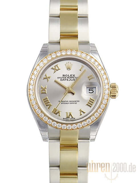 Gehäuse aus Edelstahl poliert und satiniert, Gehäusedurchmesser 28 mm, Lünette aus 18 kt Gelbgold mit Diamanten, Oyster Edelstahl / 18 kt Gelbgold Armband poliert und satiniert mit Faltschließe, Silberfarbenes Zifferblatt mit römischen Ziffern, Automatikwerk, Rolex Manufakturkaliber 2236 mit 31 Steine, 28.800 A/h, Gangreserve ca. 55 Stunden, Datumsanzeige, Chronometer, kratzfestes Saphirglas, verschraubte Krone aus 18 kt Gelbgold, Edelstahlboden verschraubt, Wasserdicht bis zu 10 bar.