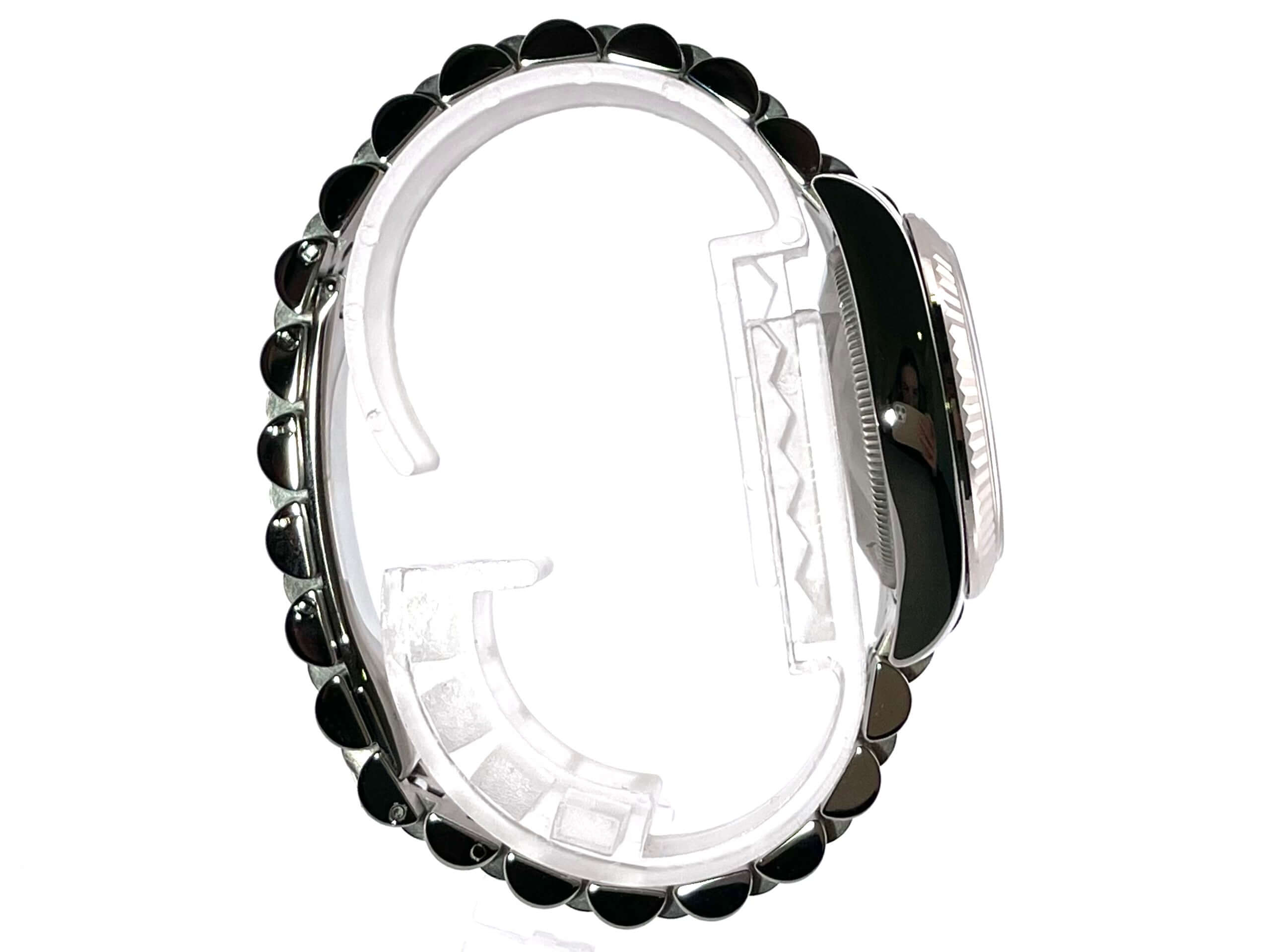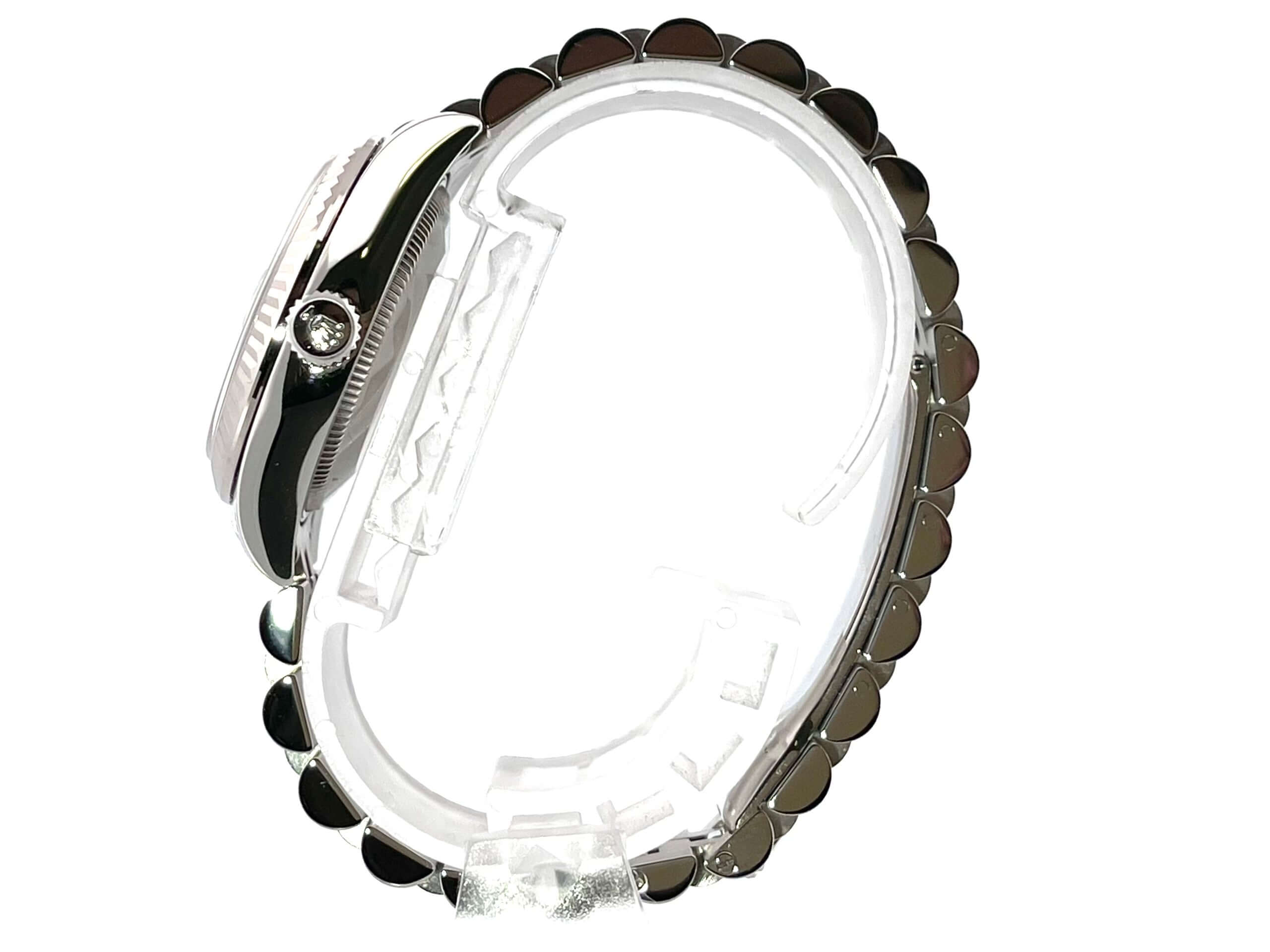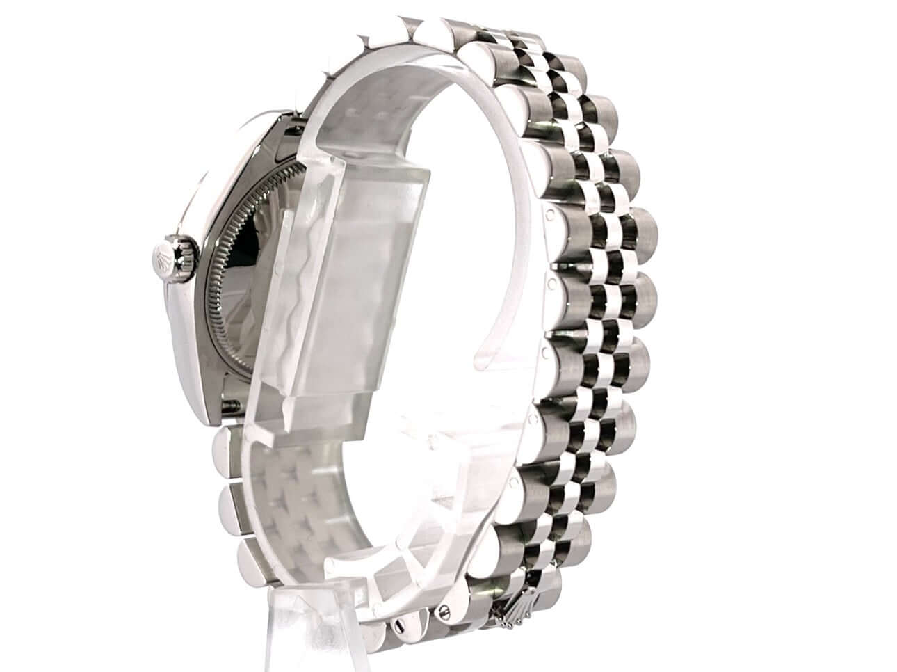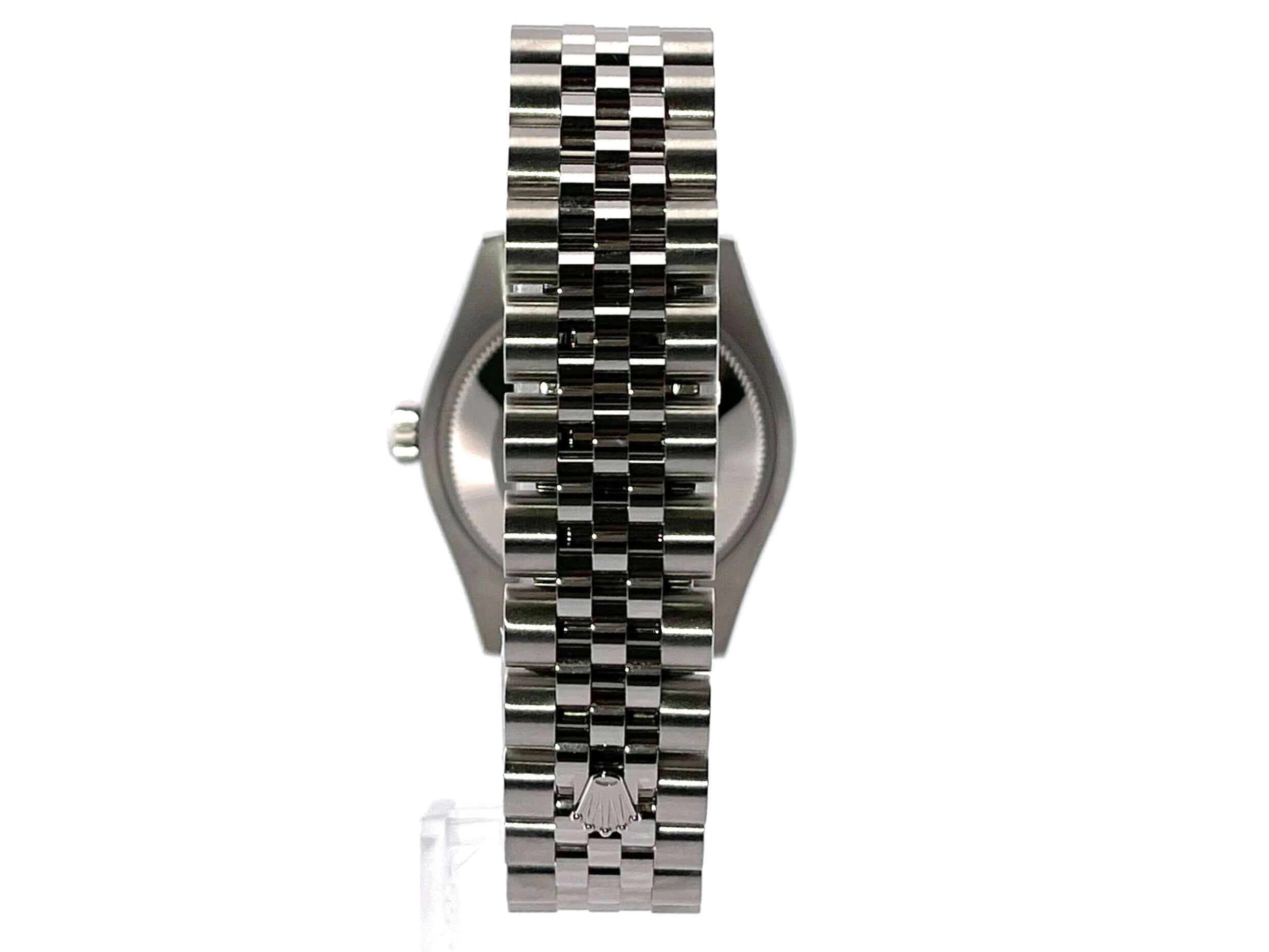 Gehäuse aus Edelstahl poliert und satiniert, Gehäusedurchmesser 31 mm, Lünette aus 18 kt Weißgold geriffelt, Jubile-Edelstahlband poliert und satiniert mit Faltschließe, Perlmutt Zifferblatt mit Diamanten, Automatik, Rolex Manufakturkaliber 2235, Datum, Chronometer, Saphirglas, Krone verschraubt, Edelstahlboden verschraubt, Wasserdicht bis 10 bar.