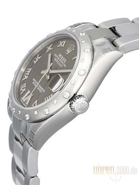 Gehäuse aus Edelstahl poliert und satiniert, Gehäusedurchmesser 31 mm, Lünette aus 18 kt Weißgold mit 24 Diamanten besetzt, Oyster Edelstahl Armband poliert und satiniert mit Faltschließe, Bronze Diamant Zifferblatt mit aufgesetzten römischen Ziffern und 11 Diamanten auf der VI, Automatik, Rolex Manufakturkaliber 2235, Chronometer, Datum, Saphirglas, verschraubte Krone, Edelstahlboden verschraubt, Wasserdicht bis 10 bar.