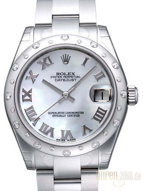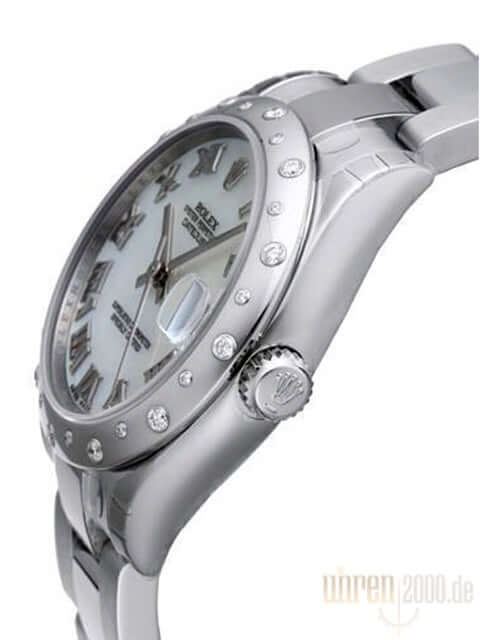 Gehäuse aus Edelstahl poliert und satiniert, Gehäusedurchmesser 31 mm, Lünette aus 18 kt Weißgold mit 24 Diamanten besetzt, Oyster Edelstahl Armband poliert und satiniert mit Faltschließe, Perlmutt Zifferblatt mit aufgesetzten römischen Ziffern, Automatik, Rolex Manufakturkaliber 2235, Chronometer, Datum, Saphirglas, verschraubte Krone, Edelstahlboden verschraubt, Wasserdicht bis 10 bar.
