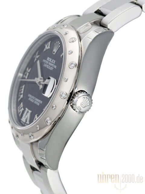 Gehäuse aus Edelstahl poliert und satiniert, Gehäusedurchmesser 31 mm, Lünette aus 18 kt Weißgold mit 24 Diamanten besetzt, Oyster Edelstahl Armband poliert und satiniert mit Faltschließe, Purple Diamant Zifferblatt mit aufgesetzten römischen Ziffern und 11 Diamanten auf der VI, Automatik, Rolex Manufakturkaliber 2235, Chronometer, Datum, Saphirglas, verschraubte Krone, Edelstahlboden verschraubt, Wasserdicht bis 10 bar.