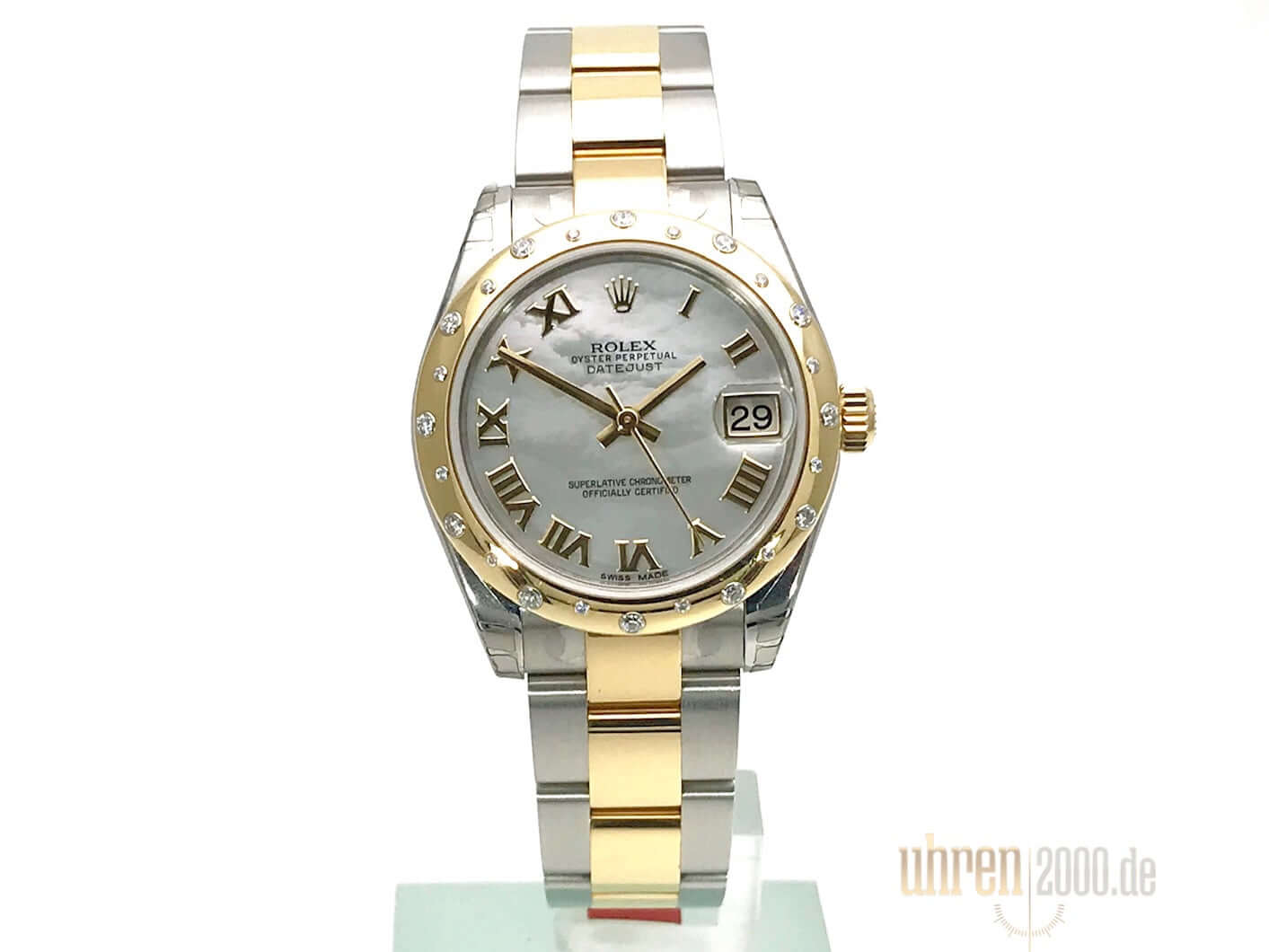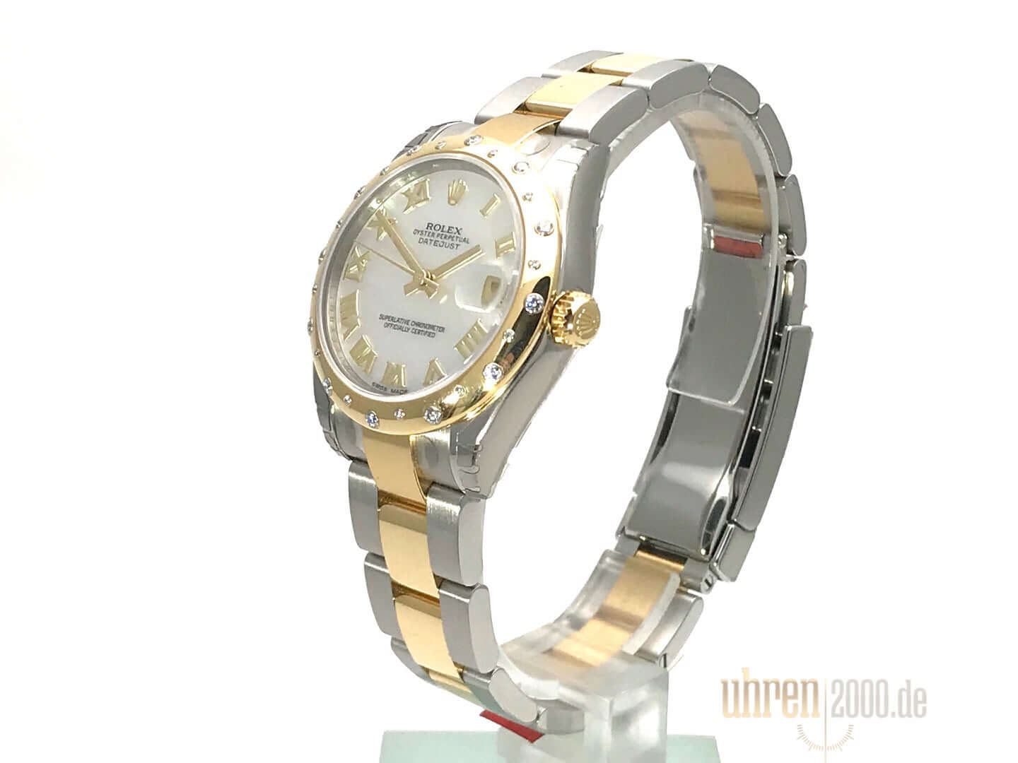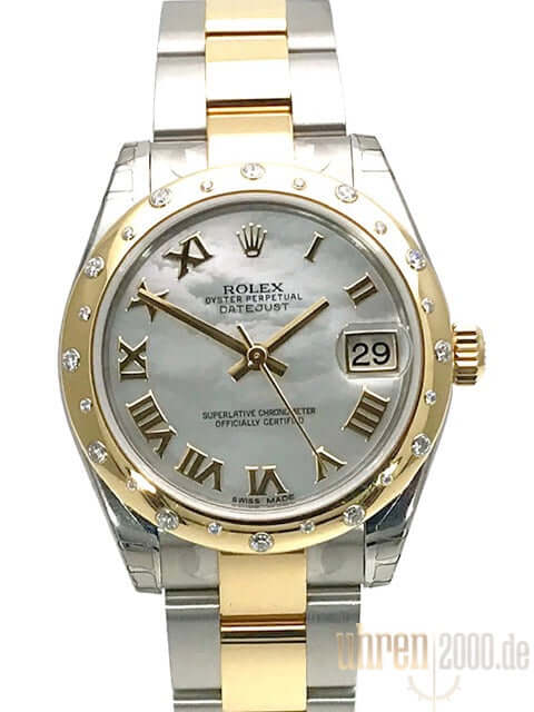 Gehäuse aus Edelstahl / Gelbgold poliert und satiniert, Gehäusedurchmesser 31 mm, polierte Lünette aus 18 kt Gelbgold mit 24 Diamanten besetzt, Oyster Edelstahl / 18 kt Gelbgold Armband poliert und satiniert mit Faltschließe, Perlmutt Zifferblatt mit römischen Ziffern, goldene Zeiger, Automatikwerk, Rolex Manufakturkaliber 2235 mit 31 Steine, 28.800 A/h, Datum, Chronometer, kratzfestes Saphirglas, verschraubte Krone aus 18 kt Gelbgold, Edelstahlboden verschraubt, Wasserdicht bis zu 10 bar.