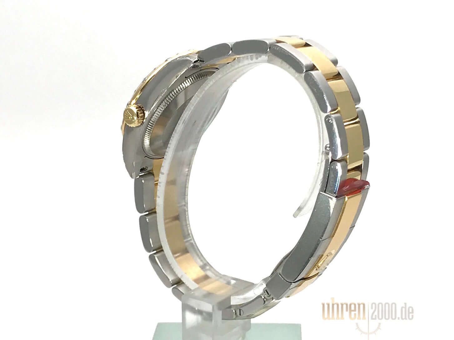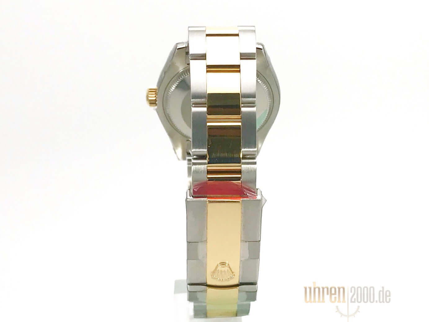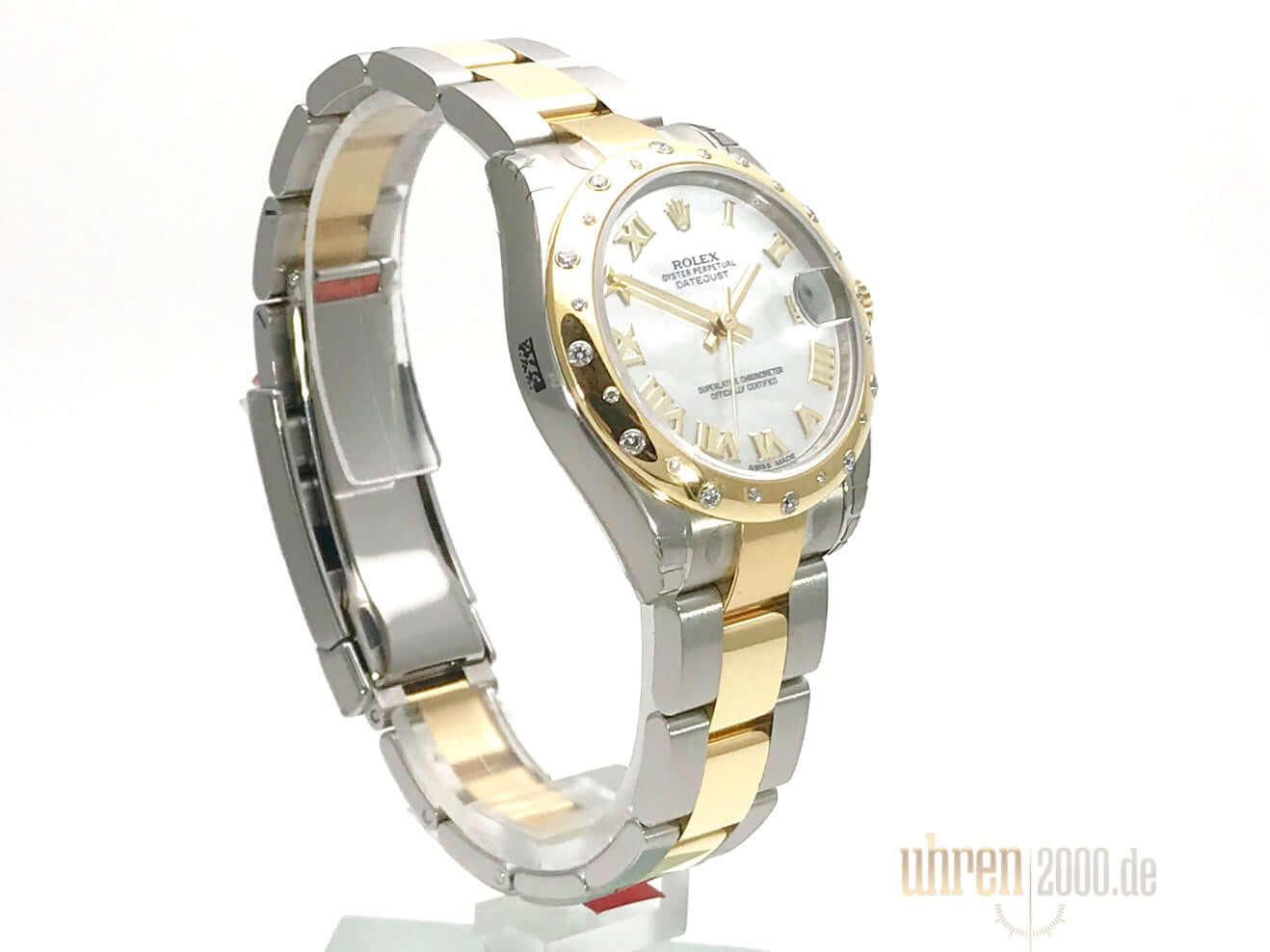 Gehäuse aus Edelstahl / Gelbgold poliert und satiniert, Gehäusedurchmesser 31 mm, polierte Lünette aus 18 kt Gelbgold mit 24 Diamanten besetzt, Oyster Edelstahl / 18 kt Gelbgold Armband poliert und satiniert mit Faltschließe, Perlmutt Zifferblatt mit römischen Ziffern, goldene Zeiger, Automatikwerk, Rolex Manufakturkaliber 2235 mit 31 Steine, 28.800 A/h, Datum, Chronometer, kratzfestes Saphirglas, verschraubte Krone aus 18 kt Gelbgold, Edelstahlboden verschraubt, Wasserdicht bis zu 10 bar.