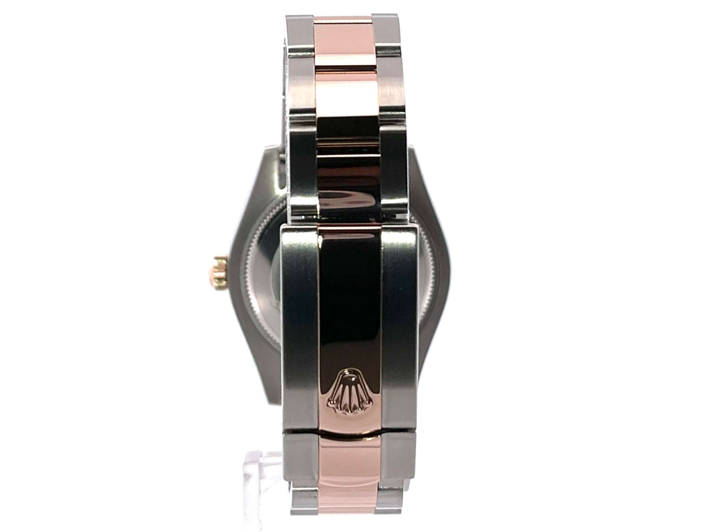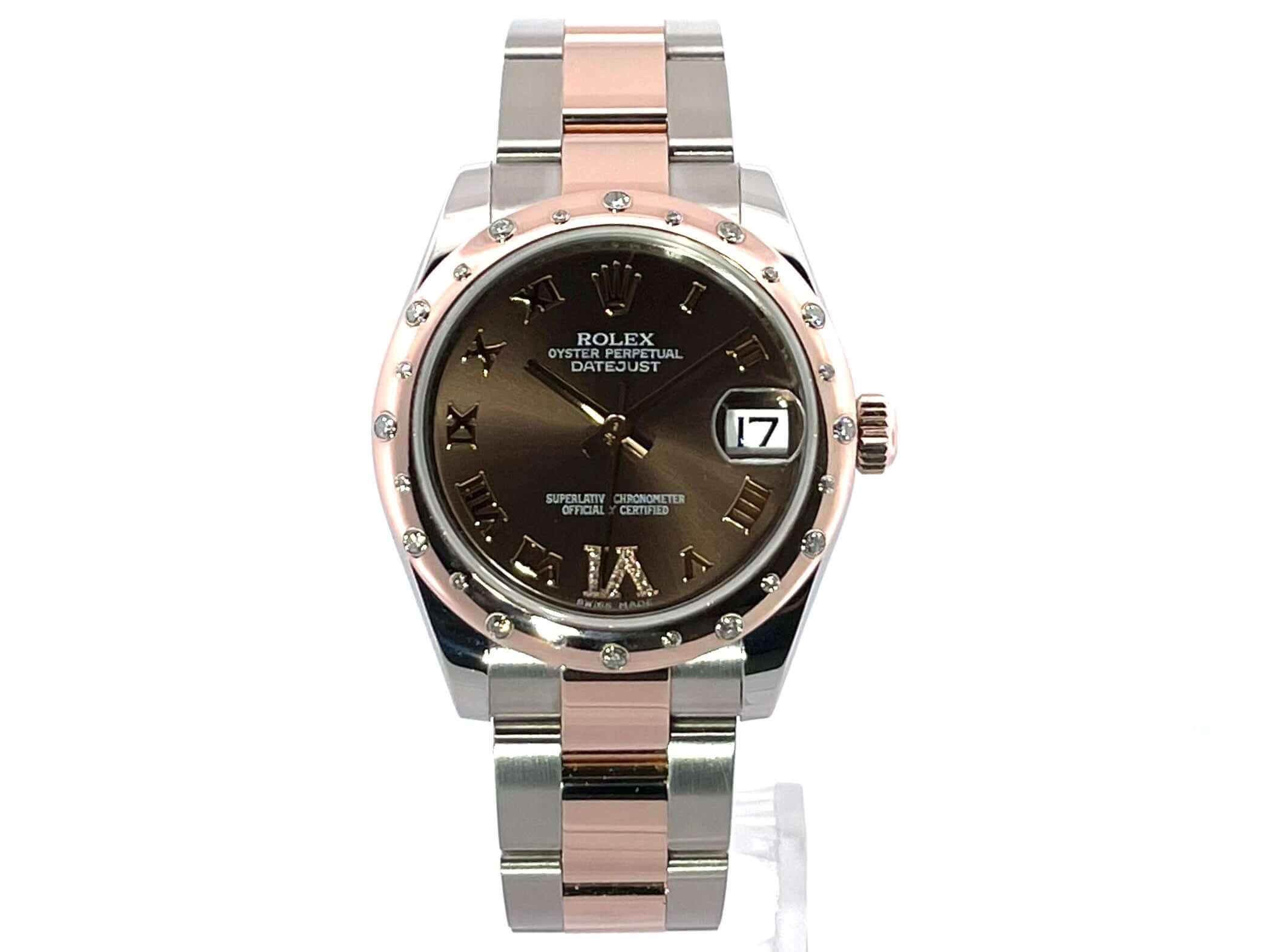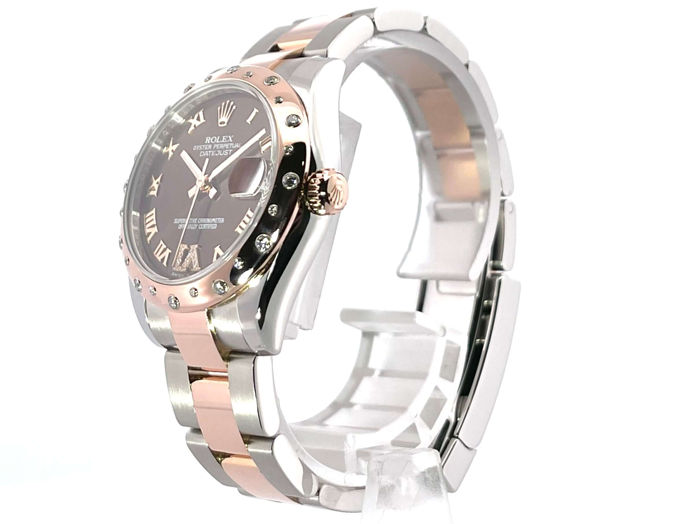 Gehäuse aus Edelstahl poliert und satiniert, Gehäusedurchmesser 31 mm, polierte Lünette aus 18 kt Everose-Gold mit 24 Diamanten besetzt, Oyster Edelstahl / 18 kt Everose-Gold Armband poliert und satiniert mit Faltschließe, Choco Zifferblatt mit römischen Ziffern und Diamanten in der VI, roségoldene Zeiger, Automatikwerk, Rolex Manufakturkaliber 2235 mit 31 Steine, 28.800 A/h, Chronometer, Datum, kratzfestes Saphirglas, verschraubte Krone aus 18 kt Everose-Gold, Edelstahlboden verschraubt, Wasserdicht bis zu 10 bar.
