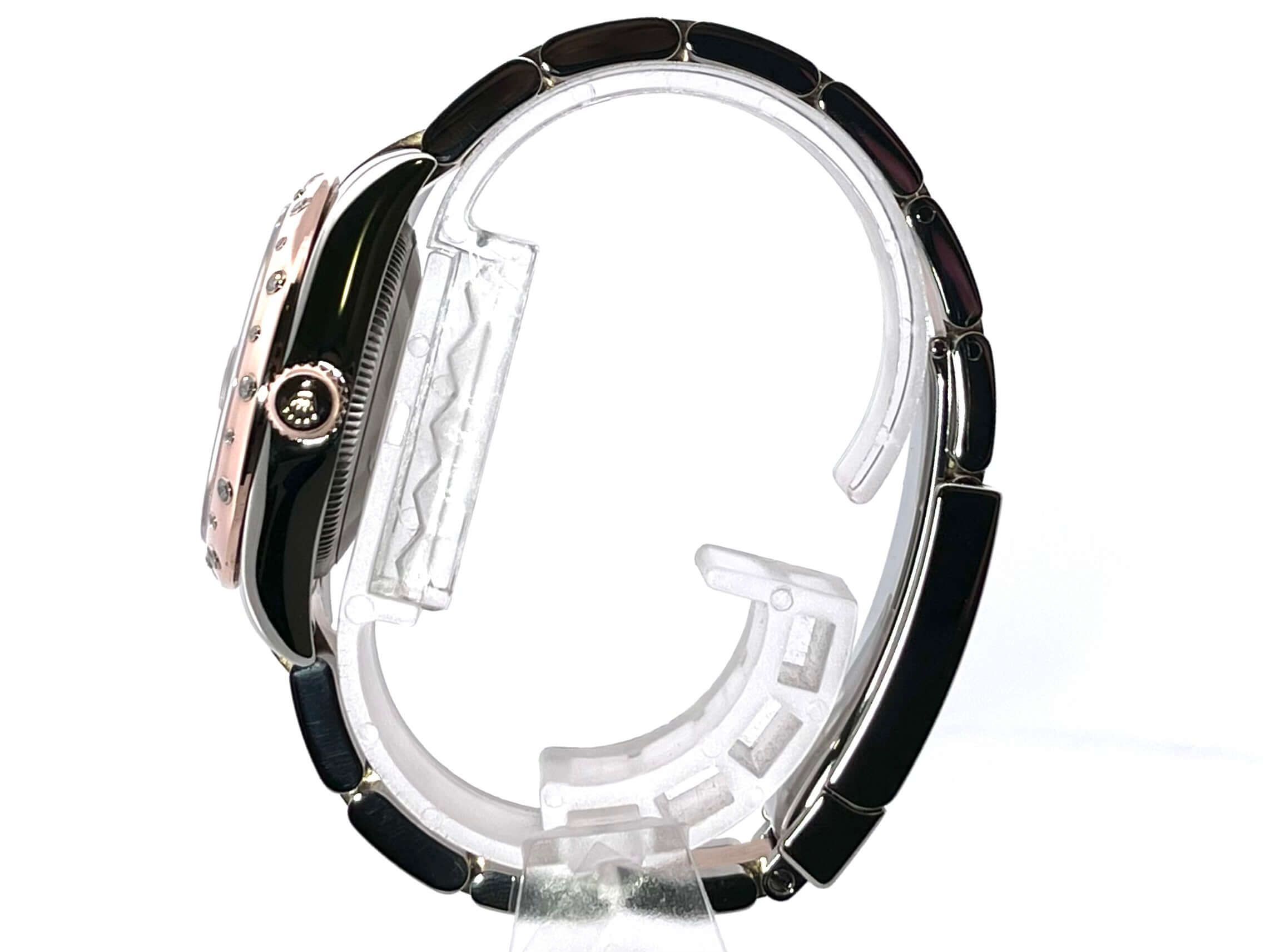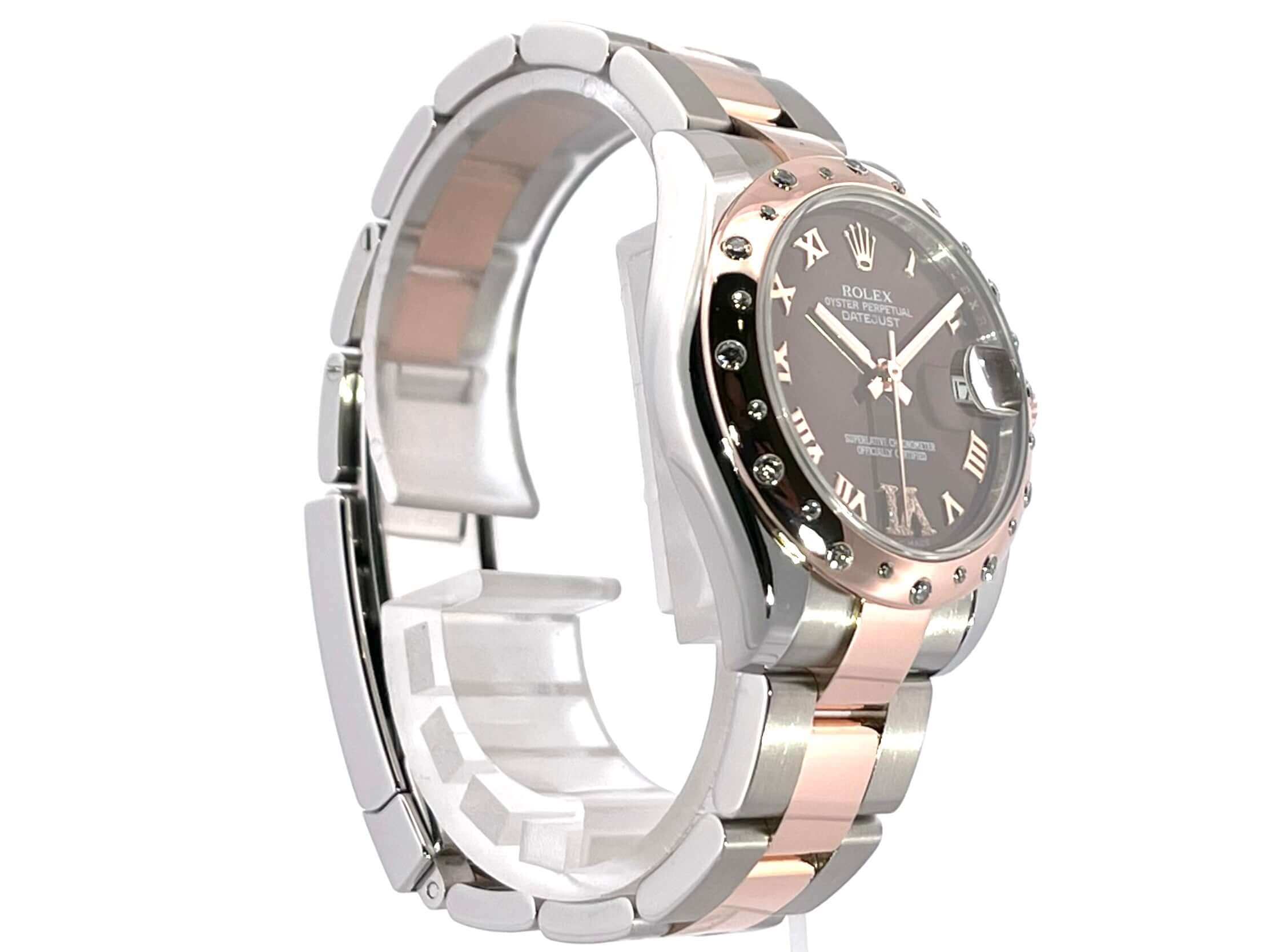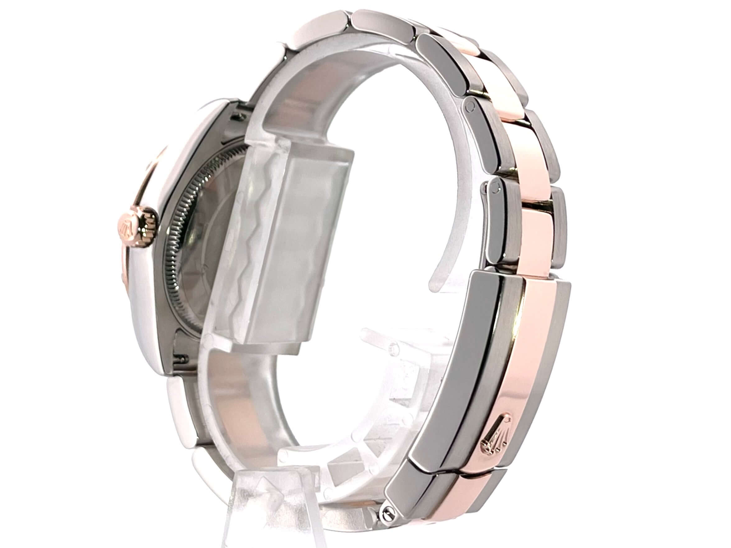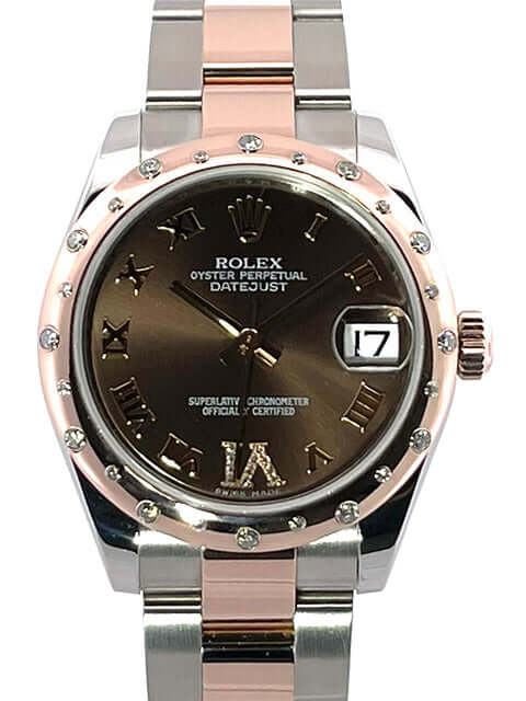 Gehäuse aus Edelstahl poliert und satiniert, Gehäusedurchmesser 31 mm, polierte Lünette aus 18 kt Everose-Gold mit 24 Diamanten besetzt, Oyster Edelstahl / 18 kt Everose-Gold Armband poliert und satiniert mit Faltschließe, Choco Zifferblatt mit römischen Ziffern und Diamanten in der VI, roségoldene Zeiger, Automatikwerk, Rolex Manufakturkaliber 2235 mit 31 Steine, 28.800 A/h, Chronometer, Datum, kratzfestes Saphirglas, verschraubte Krone aus 18 kt Everose-Gold, Edelstahlboden verschraubt, Wasserdicht bis zu 10 bar.