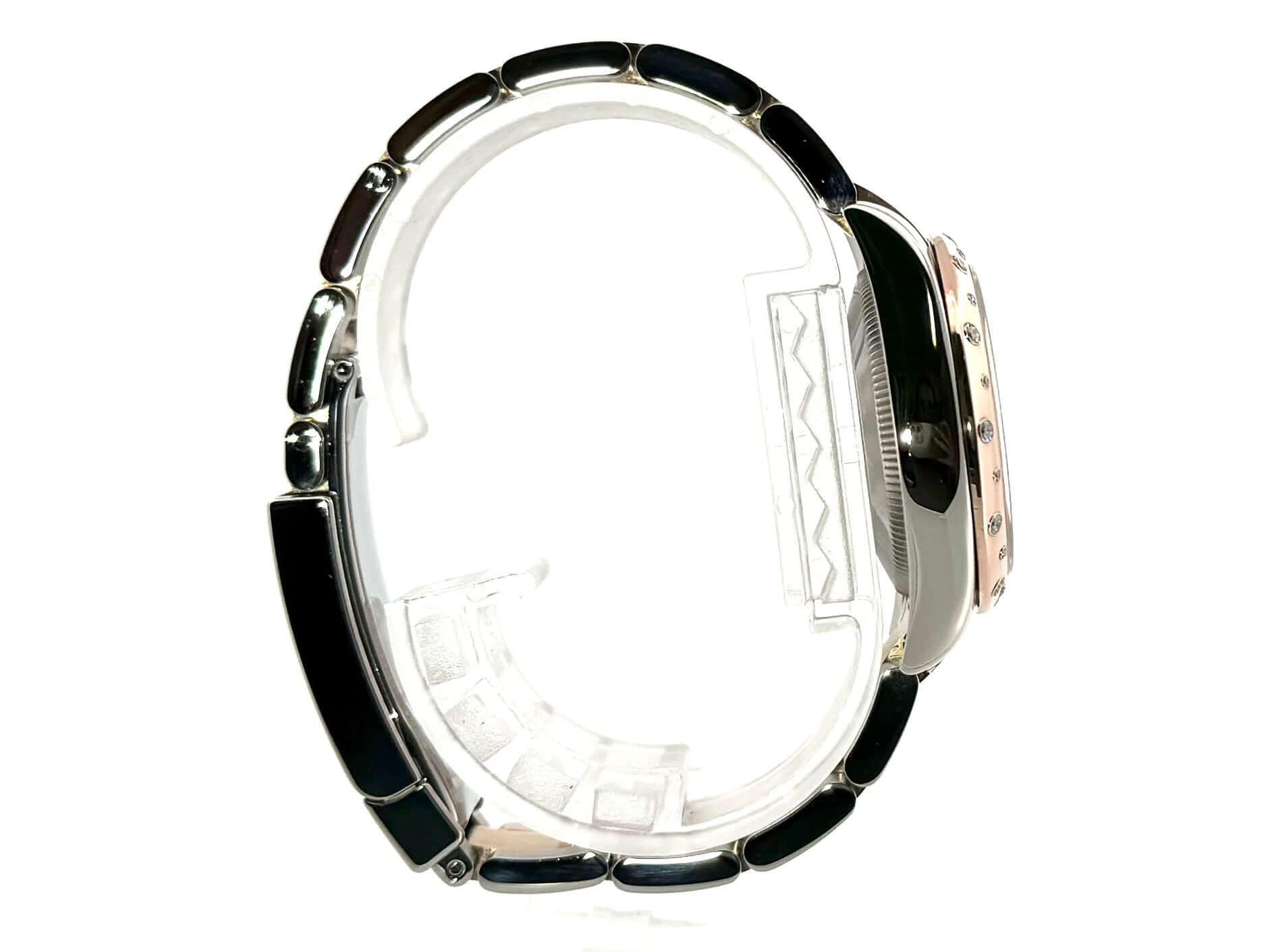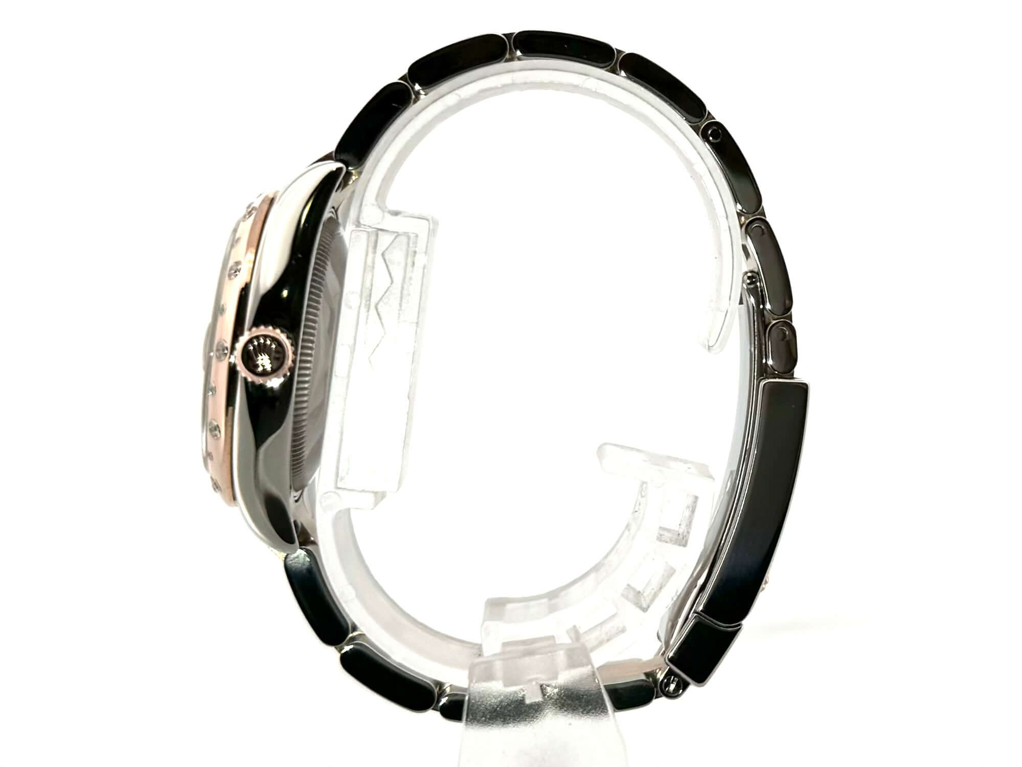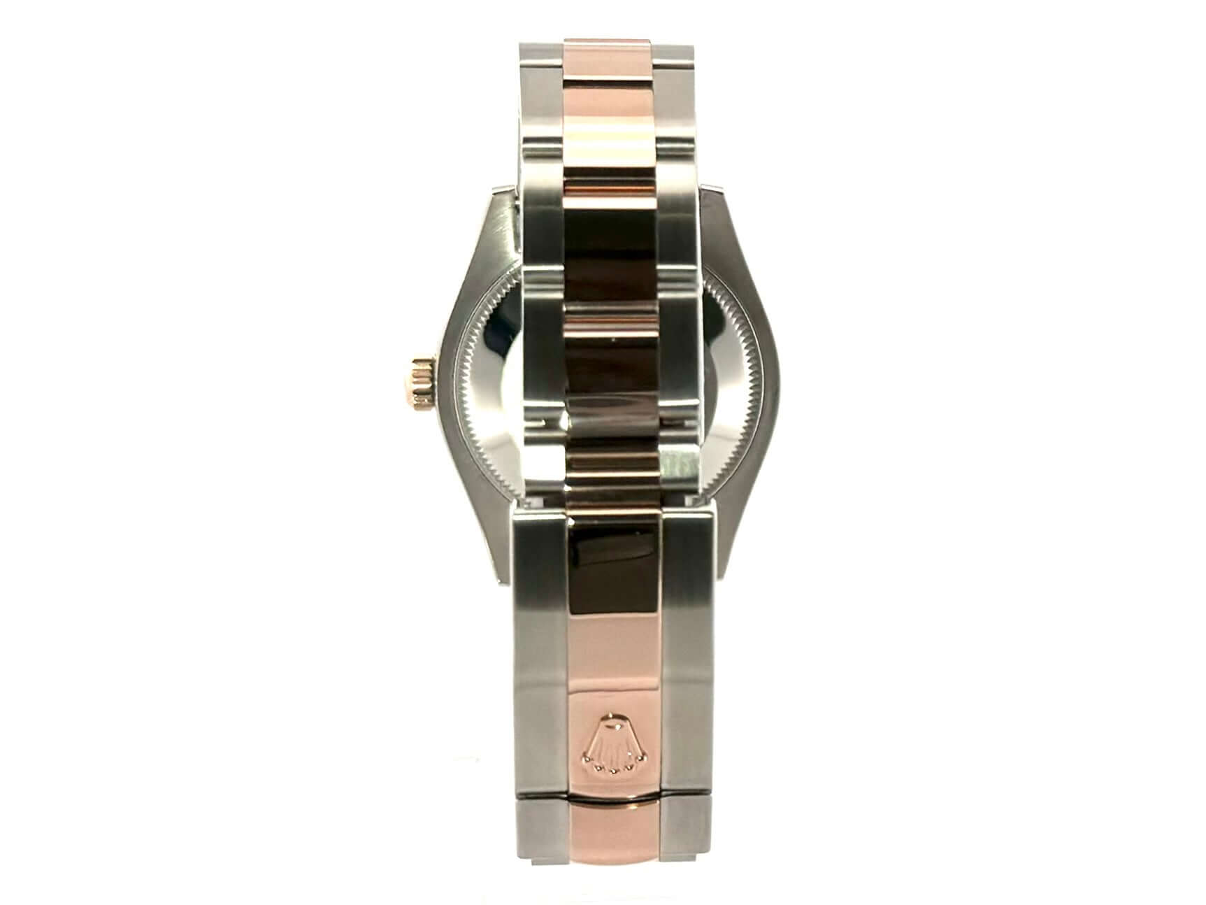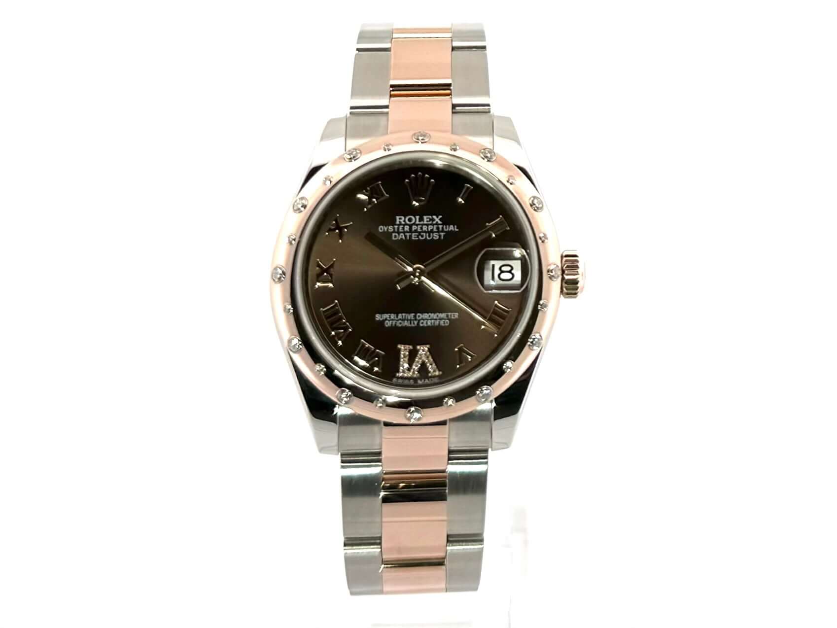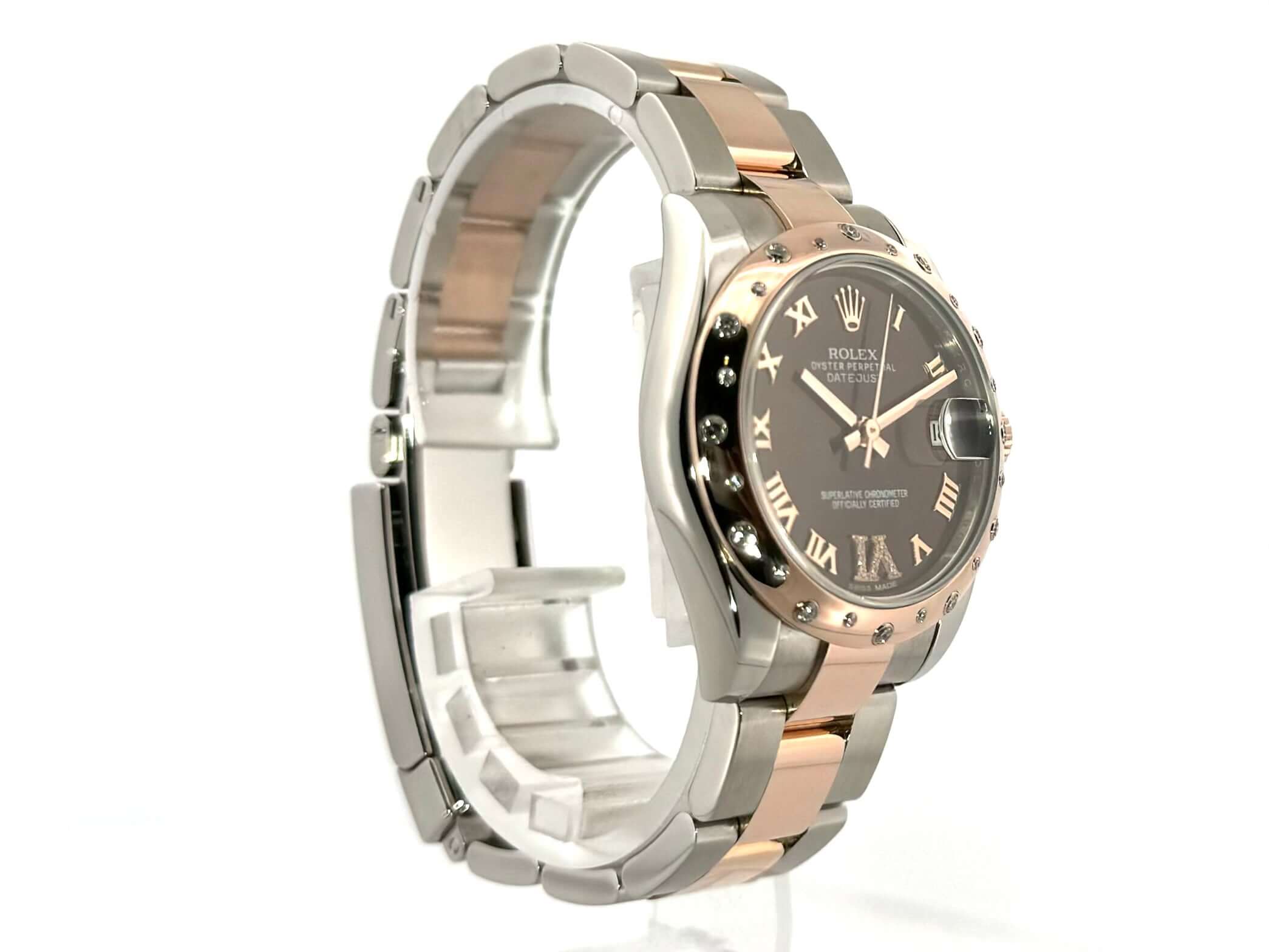 Gehäuse aus Edelstahl poliert und satiniert, Gehäusedurchmesser 31 mm, polierte Lünette aus 18 kt Everose-Gold mit 24 Diamanten besetzt, Oyster Edelstahl / 18 kt Everose-Gold Armband poliert und satiniert mit Faltschließe, Choco Zifferblatt mit römischen Ziffern und Diamanten in der VI, roségoldene Zeiger, Automatikwerk, Rolex Manufakturkaliber 2235 mit 31 Steine, 28.800 A/h, Chronometer, Datum, kratzfestes Saphirglas, verschraubte Krone aus 18 kt Everose-Gold, Edelstahlboden verschraubt, Wasserdicht bis zu 10 bar.