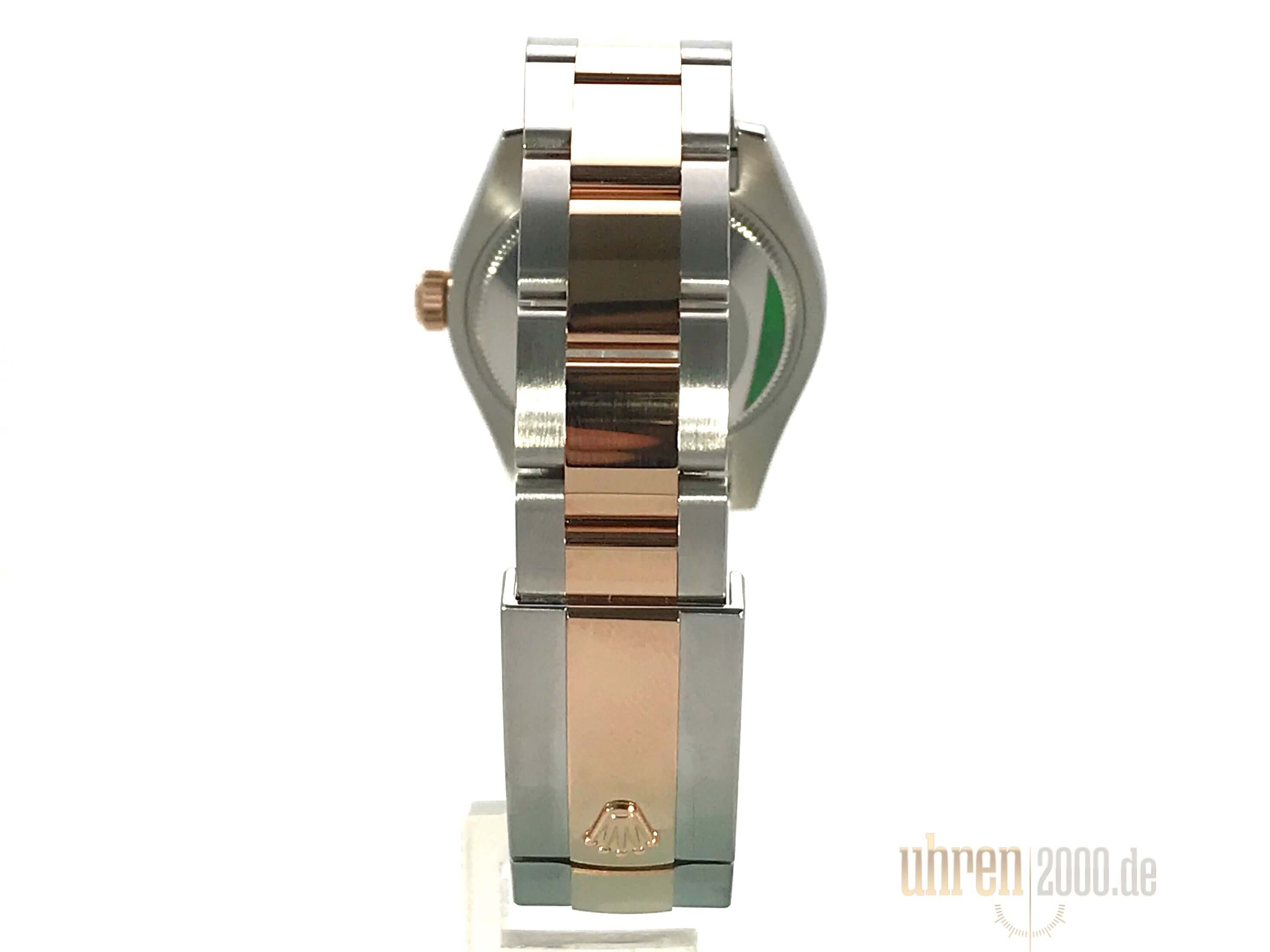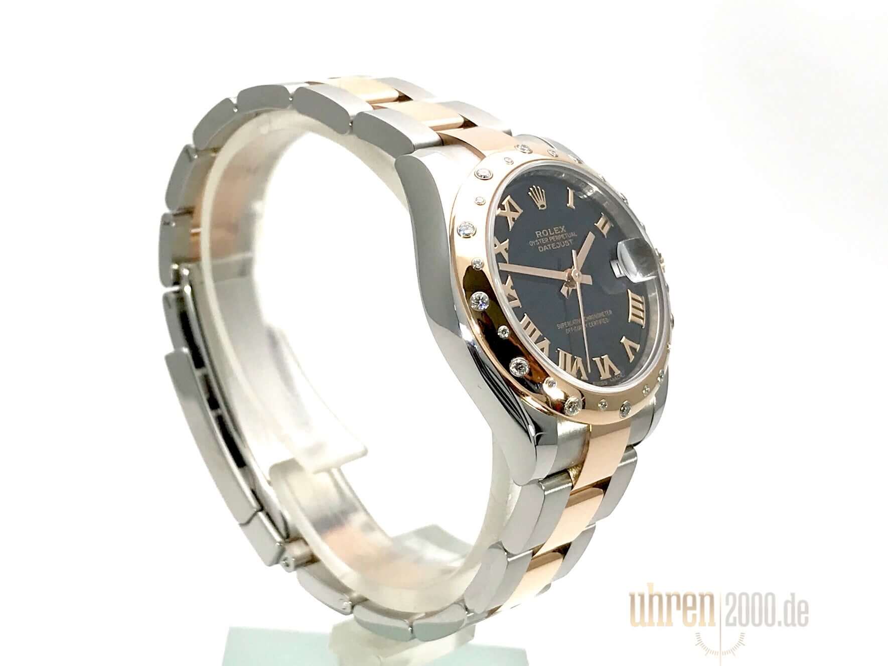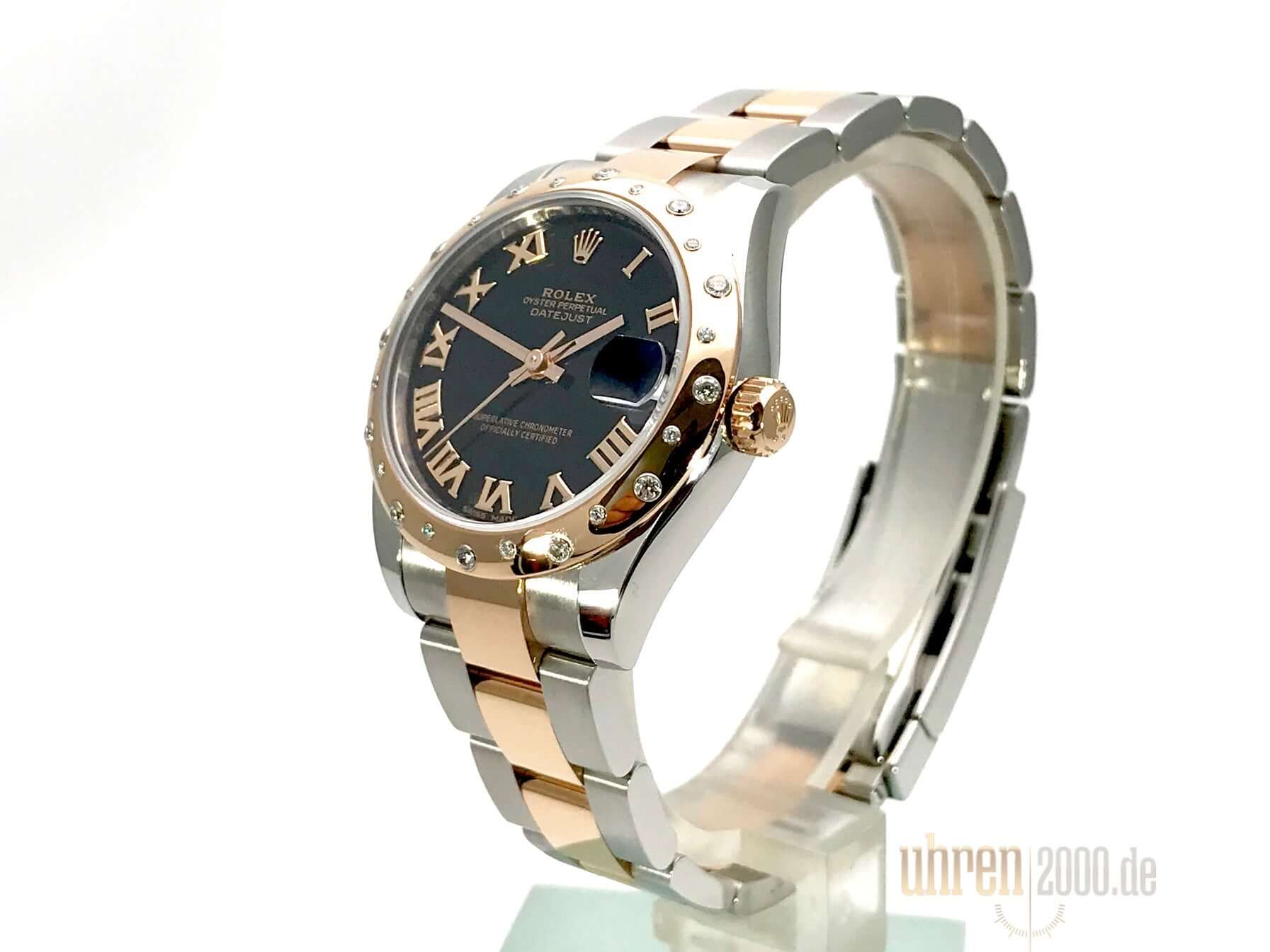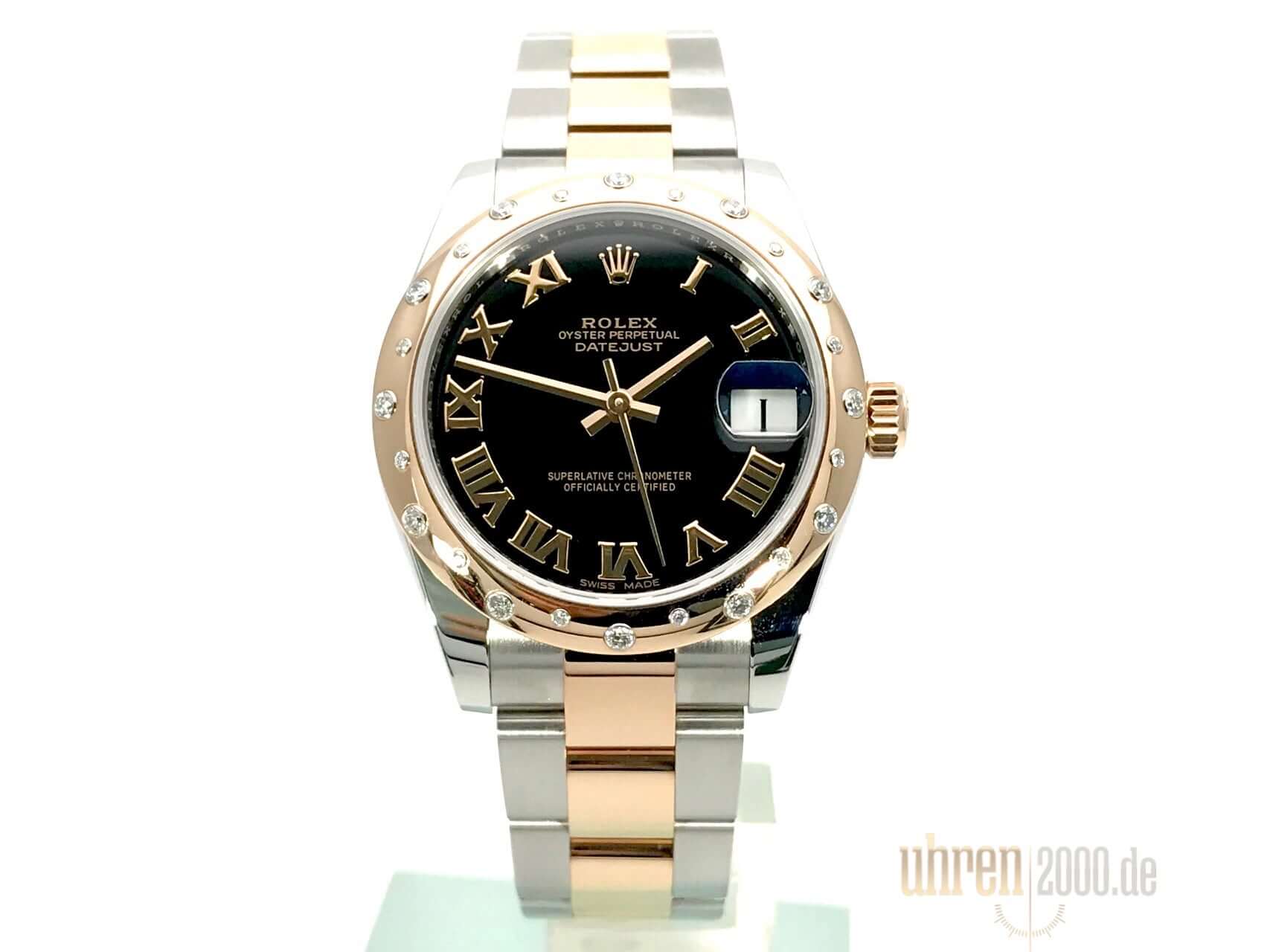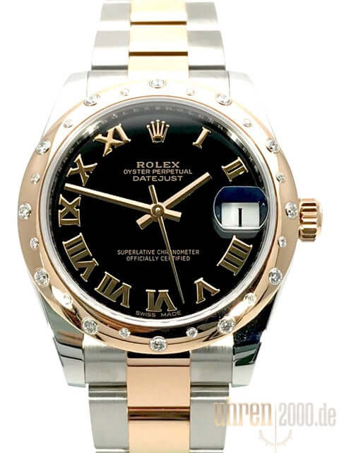 Gehäuse aus Edelstahl poliert und satiniert, Gehäusedurchmesser 31 mm, polierte Lünette aus 18 kt Everose-Gold mit 24 Diamanten besetzt, Oyster Edelstahl / 18 kt Everose-Gold Armband poliert und satiniert mit Faltschließe, schwarzes Zifferblatt mit römischen Ziffern, roségoldene Zeiger, Automatikwerk, Rolex Manufakturkaliber 2235 mit 31 Steine, 28.800 A/h, Chronometer, Datum, kratzfestes Saphirglas, verschraubte Krone aus 18 kt Everose-Gold, Edelstahlboden verschraubt, Wasserdicht bis zu 10 bar.
