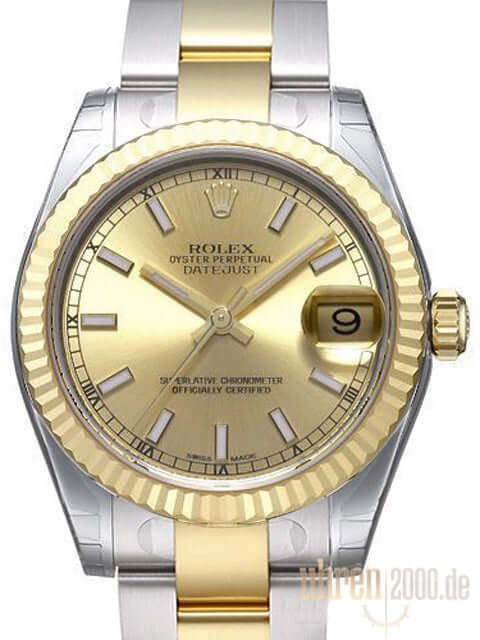 Gehäuse aus Edelstahl poliert und satiniert, Gehäusedurchmesser 31 mm, geriffelte Lünette aus 18 kt Gelbgold, Oyster Edelstahl / 18 kt Gelbgold Armband poliert und satiniert mit Faltschließe, Champagner Zifferblatt mit aufgesetzten Indezes, goldene Leuchtzeiger, Automatikwerk, Chronometer, Rolex Manufakturkaliber 2235 mit 31 Steine, 28.800 A/h, Datumsanzeige, kratzfestes Saphirglas, verschraubte Krone aus 18 kt Gelbgold, Edelstahlboden verschraubt, Wasserdicht bis zu 10 bar.