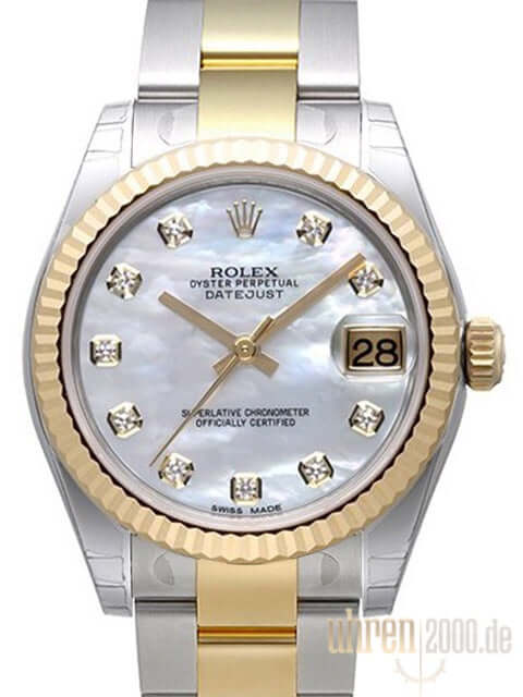 Gehäuse aus Edelstahl poliert und satiniert, Gehäusedurchmesser 31 mm, geriffelte Lünette aus 18 kt Gelbgold, Oyster Edelstahl / 18 kt Gelbgold Armband poliert und satiniert mit Faltschließe, Perlmutt Diamantzifferblatt, goldene Zeiger, Automatikwerk, Chronometer, Rolex Manufakturkaliber 2235 mit 31 Steine, 28.800 A/h, Datumsanzeige, verschraubte Krone aus 18 kt Gelbgold, kratzfestes Saphirglas, Edelstahlboden verschraubt, Wasserdicht bis zu 10 bar.