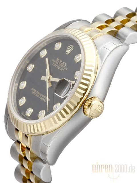 Gehäuse aus Edelstahl poliert und satiniert, Gehäusedurchmesser 31 mm, geriffelte Lünette aus 18 kt Gelbgold, Jubile Edelstahl / 18 kt Gelbgold Armband poliert und satiniert mit Faltschließe, schwarzes Diamantzifferblatt, goldene Zeiger, Automatikwerk, Chronometer, Rolex Manufakturkaliber 2235 mit 31 Steine, 28.800 A/h, Datumsanzeige, kratzfestes Saphirglas, verschraubte Krone aus 18 kt Gelbgold, Edelstahlboden verschraubt, Wasserdicht bis zu 10 bar.