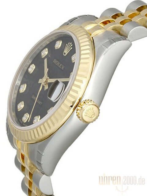 Gehäuse aus Edelstahl poliert und satiniert, Gehäusedurchmesser 31 mm, geriffelte Lünette aus 18 kt Gelbgold, Jubile Edelstahl / 18 kt Gelbgold Armband poliert und satiniert mit Faltschließe, schwarzes Jubile Diamantzifferblatt, goldene Zeiger, Automatikwerk, Rolex Manufakturkaliber 2235 mit 31 Steine, 28.800 A/h, Chronometer, Datum, kratzfestes Saphirglas, verschraubte Krone aus 18 kt Gelbgold, Edelstahlboden verschraubt, Wasserdicht bis zu 10 bar.