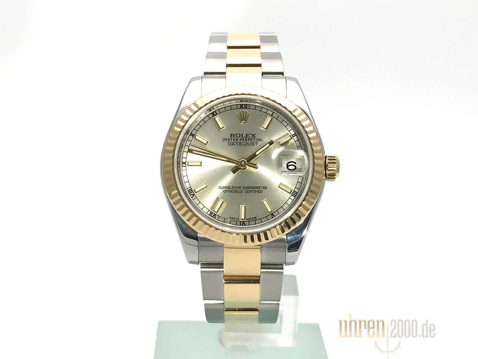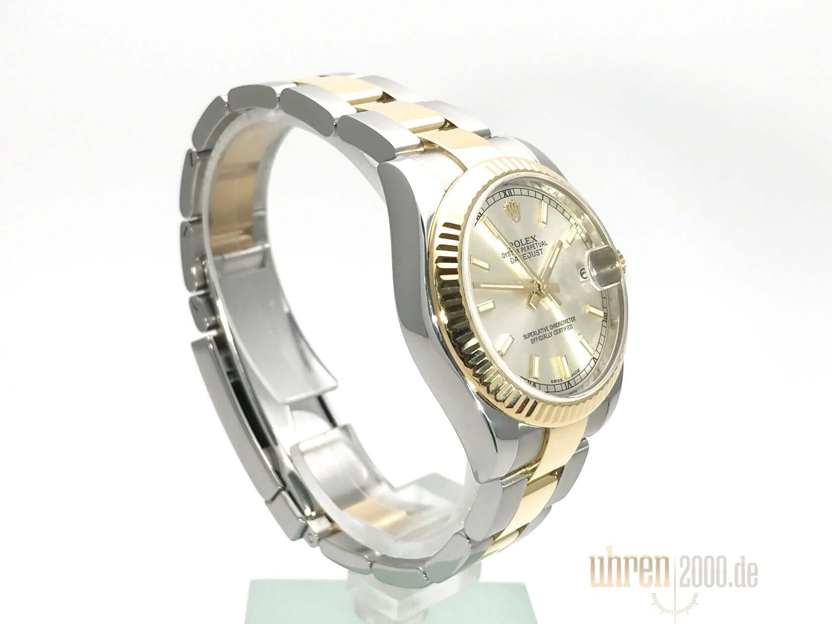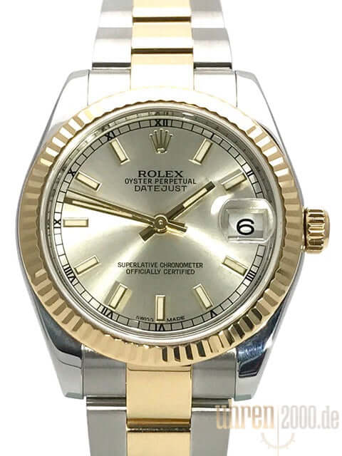 Gehäuse aus Edelstahl poliert und satiniert, Gehäusedurchmesser 31 mm, geriffelte Lünette aus 18 kt Gelbgold, Oyster Edelstahl / 18 kt Gelbgold Armband poliert und satiniert mit Faltschließe, Silberfarbenes Zifferblatt mit aufgesetzten Indizes, goldene Leuchtzeiger, Automatikwerk, Chronometer, Rolex Manufakturkaliber 2235 mit 31 Steine, 28.800 A/h, Datumsanzeige, kratzfestes Saphirglas, verschraubte Krone aus 18 kt Gelbgold, Edelstahlboden verschraubt, Wasserdicht bis zu 10 bar.
