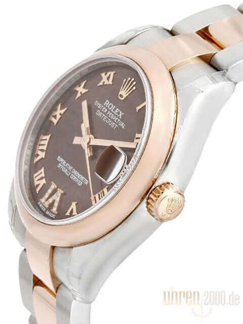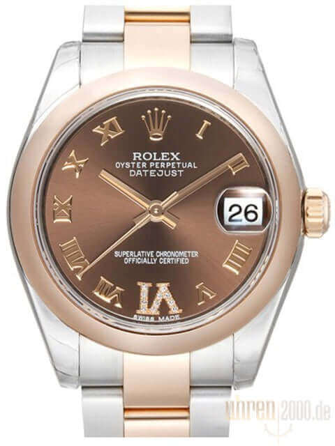 Gehäuse aus Edelstahl poliert und satiniert, Gehäusedurchmesser 31 mm, polierte Lünette aus 18 kt Roségold Everose, Oyster Edelstahl / 18 kt Roségold Everose Armband poliert und satiniert mit Faltschließe, braunes Zifferblatt mit aufgesetzten roségoldenen römischen Ziffern und Diamanten in der VI, roségoldene Zeiger, Automatikwerk, Chronometer, Rolex Manufakturkaliber 2235 mit 31 Steine, 28.800 A/h, Datumsanzeige, kratzfestes Saphirglas, verschraubte Krone aus 18 kt Roségold Everose, Edelstahlboden verschraubt, Wasserdicht bis zu 10 bar.