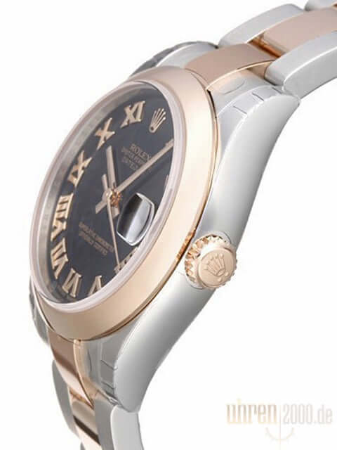Gehäuse aus Edelstahl poliert und satiniert, Gehäusedurchmesser 31 mm, polierte Lünette aus 18 kt Roségold Everose, Oyster Edelstahl / 18 kt Roségold Everose Armband poliert und satiniert mit Faltschließe, schwarzes Zifferblatt mit aufgesetzten roségoldenen römischen Ziffern, roségoldene Zeiger, Automatikwerk, Rolex Manufakturkaliber 2235 mit 31 Steine, 28.800 A/h, Chronometer, Datumsanzeige, kratzfestes Saphirglas, verschraubte Krone aus 18 kt Roségold Everose, Edelstahlboden verschraubt, Wasserdicht bis zu 10 bar.