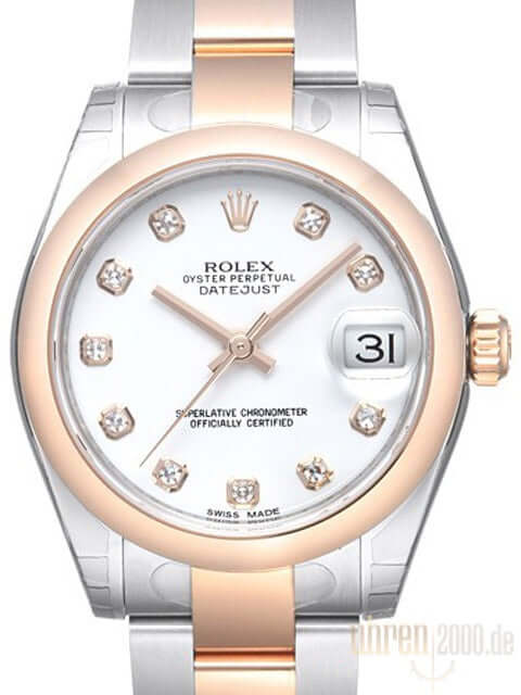 Gehäuse aus Edelstahl poliert und satiniert, Gehäusedurchmesser 31 mm, polierte Lünette aus 18 kt Roségold Everose, Oyster Edelstahl / 18 kt Roségold Everose Armband poliert und satiniert mit Faltschließe, weißes Zifferblatt mit 10 Diamanten, roségoldene Zeiger, Automatikwerk, Rolex Manufakturkaliber 2235 mit 31 Steine, 28.800 A/h, Chronometer, Datumsanzeige, kratzfestes Saphirglas, verschraubte Krone aus 18 kt Roségold Everose, Edelstahlboden verschraubt, Wasserdicht bis zu 10 bar.