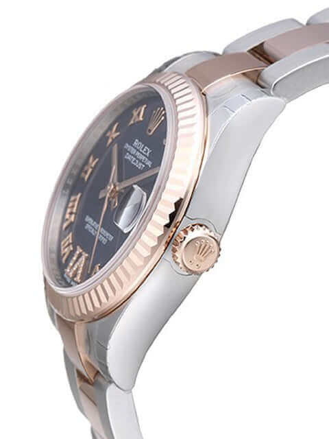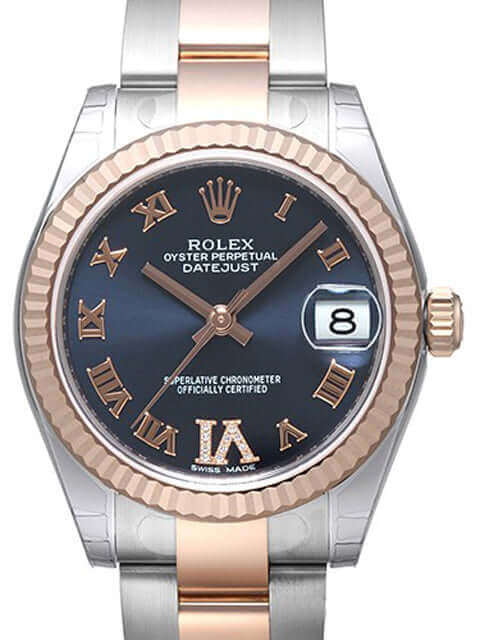 Gehäuse aus Edelstahl poliert und satiniert, Gehäusedurchmesser 31 mm, geriffelte Lünette aus 18 kt Roségold Everose, Oyster Edelstahl / 18 kt Roségold Everose Armband poliert und satiniert mit Faltschließe, Purple Zifferblatt mit aufgesetzten roségoldenen römischen Ziffern und Diamanten in der VI, roségoldene Zeiger, Automatikwerk, Chronometer, Rolex Manufakturkaliber 2235 mit 31 Steine, 28.800 A/h, Datumsanzeige, kratzfestes Saphirglas, verschraubte Krone aus 18 kt Roségold Everose, Edelstahlboden verschraubt, Wasserdicht bis zu 10 bar.