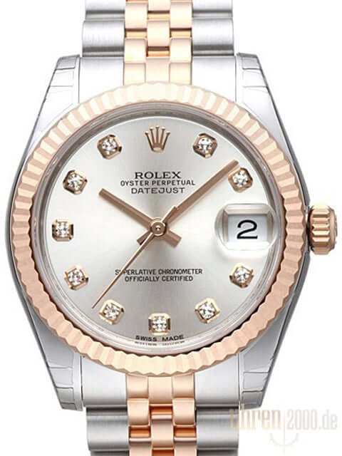 Gehäuse aus Edelstahl poliert und satiniert, Gehäusedurchmesser 31 mm, geriffelte Lünette aus 18 kt Roségold Everose, Jubilé Edelstahl / 18 kt Roségold Everose Armband poliert und satiniert mit Faltschließe, silberfarbenes Zifferblatt mit 10 aufgesetzten Diamanten, roségoldene Zeiger, Automatikwerk, Chronometer, Rolex Manufakturkaliber 2235 mit 31 Steine, 28.800 A/h, Datumsanzeige, kratzfestes Saphirglas, verschraubte Krone aus 18 kt Roségold Everose, Edelstahlboden verschraubt, Wasserdicht bis zu 10 bar.