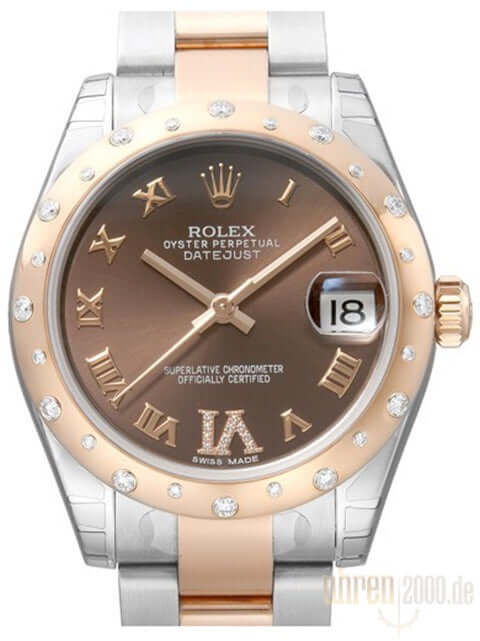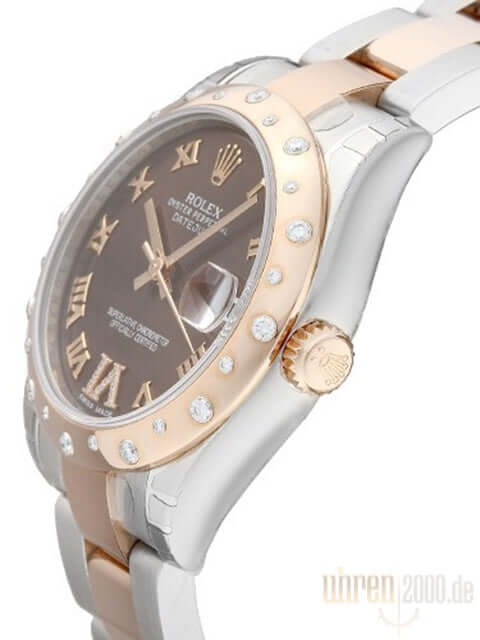 Gehäuse aus Edelstahl poliert und satiniert, Gehäusedurchmesser 31 mm, polierte Lünette aus 18 kt Roségold Everose mit 24 Diamanten besetzt, Oyster Edelstahl / 18 kt Roségold Everose Armband poliert und satiniert mit Faltschließe, Choco Zifferblatt mit römischen Ziffern und Diamanten in der VI, roségoldene Zeiger, Automatikwerk, Rolex Manufakturkaliber 2235 mit 31 Steine, 28.800 A/h, Chronometer, Datum, kratzfestes Saphirglas, verschraubte Krone aus 18 kt Roségold Everose, Edelstahlboden verschraubt, Wasserdicht bis zu 10 bar.