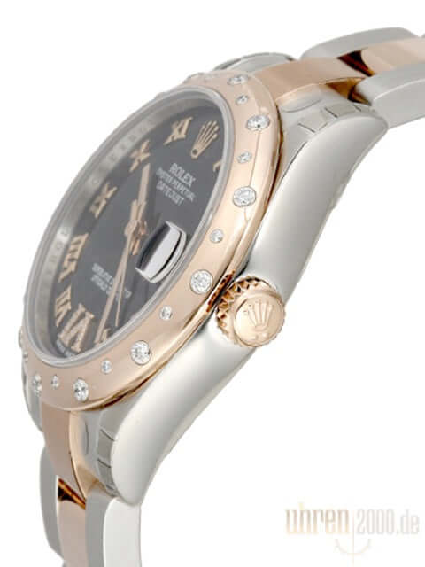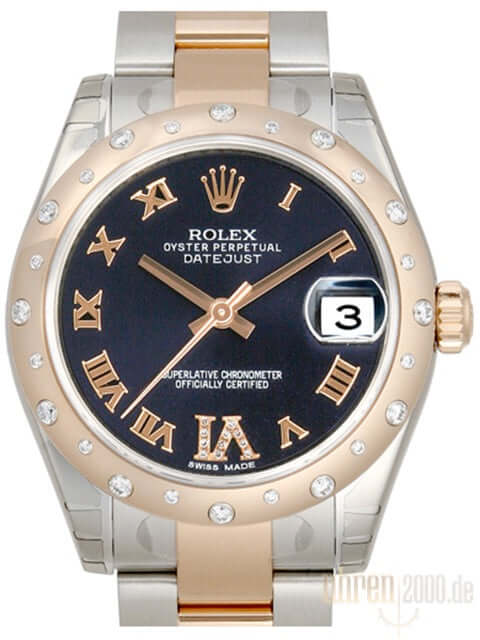 Gehäuse aus Edelstahl poliert und satiniert, Gehäusedurchmesser 31 mm, polierte Lünette aus 18 kt Roségold Everose mit 24 Diamanten besetzt, Oyster Edelstahl / 18 kt Roségold Everose Armband poliert und satiniert mit Faltschließe, Purple Zifferblatt mit römischen Ziffern und Diamanten in der VI, roségoldene Zeiger, Automatikwerk, Rolex Manufakturkaliber 2235 mit 31 Steine, 28.800 A/h, Chronometer, Datum, kratzfestes Saphirglas, verschraubte Krone aus 18 kt Roségold Everose, Edelstahlboden verschraubt, Wasserdicht bis zu 10 bar.
