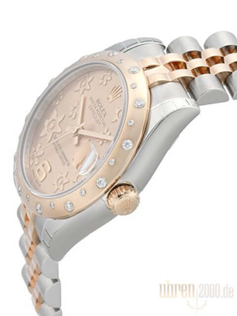 Gehäuse aus Edelstahl / Roségold poliert und satiniert, Gehäusedurchmesser 31 mm, polierte Lünette aus 18 kt Roségold Everose mit 24 Diamanten besetzt, Jubilé Edelstahl / 18 kt Roségold Everose Armband poliert und satiniert mit Faltschließe, pinkfarbenes Floral Zifferblatt, roségoldene Zeiger, Automatikwerk, Rolex Manufakturkaliber 2235 mit 31 Steine, 28.800 A/h, Chronometer, Datumsanzeige, kratzfestes Saphirglas, verschraubte Krone aus 18 kt Roségold Everose, Edelstahlboden verschraubt, Wasserdicht bis zu 10 bar.