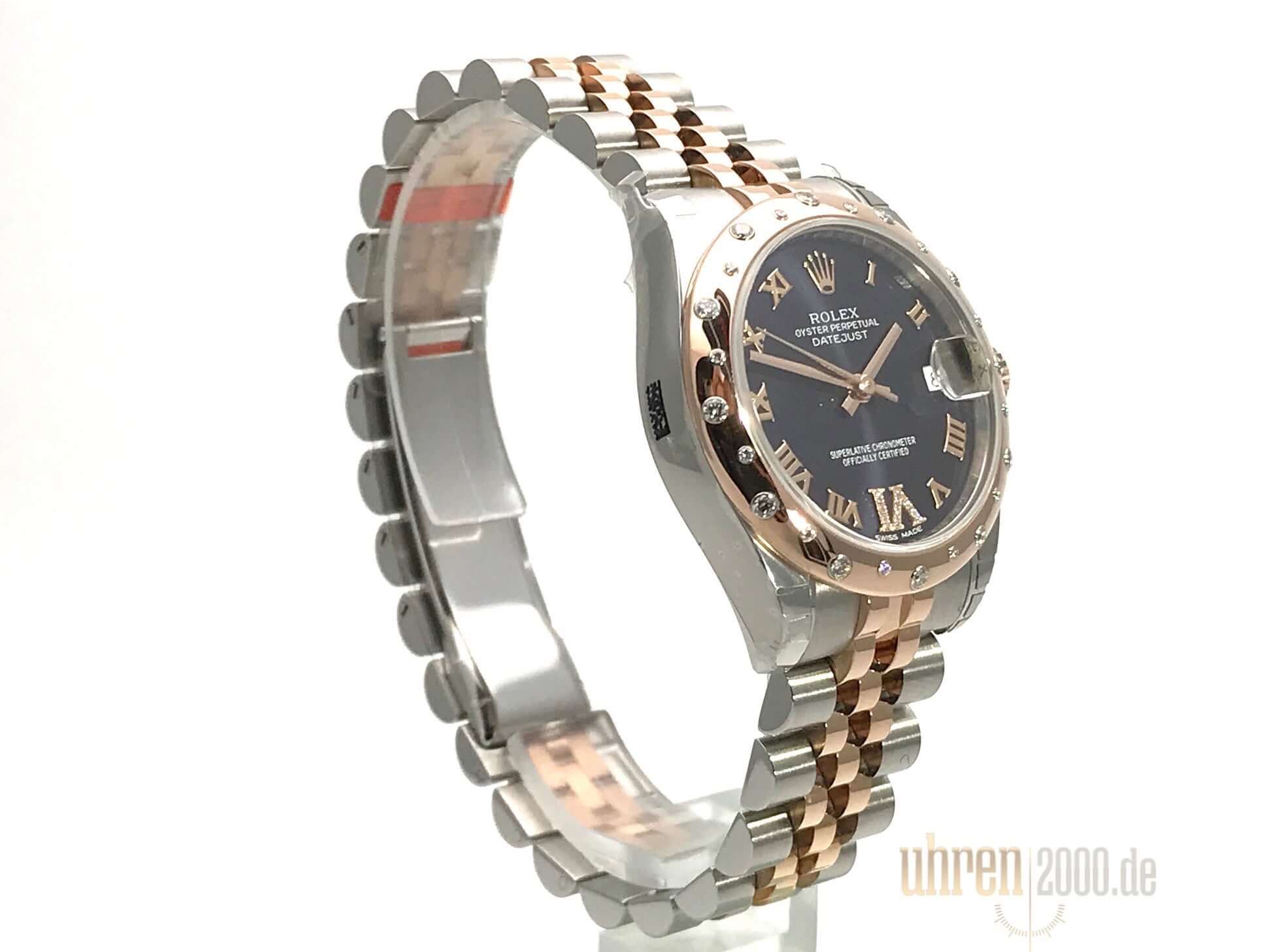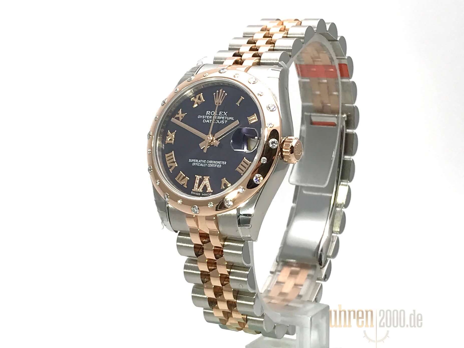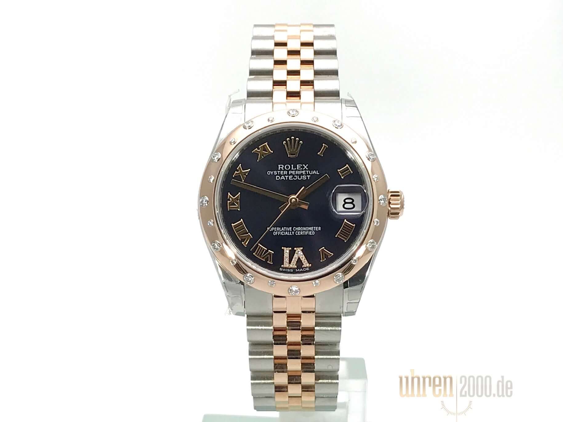 Gehäuse aus Edelstahl / Roségold poliert und satiniert, Gehäusedurchmesser 31 mm, polierte Lünette aus 18 kt Roségold Everose mit 24 Diamanten besetzt, Jubilé Edelstahl / 18 kt Roségold Everose Armband poliert und satiniert mit Faltschließe, Purple Zifferblatt mit römischen Ziffern und Diamanten in der VI, roségoldene Zeiger, Automatikwerk, Rolex Manufakturkaliber 2235 mit 31 Steine, 28.800 A/h, Chronometer, Datumsanzeige, kratzfestes Saphirglas, verschraubte Krone aus 18 kt Roségold Everose, Edelstahlboden verschraubt, Wasserdicht bis zu 10 bar.