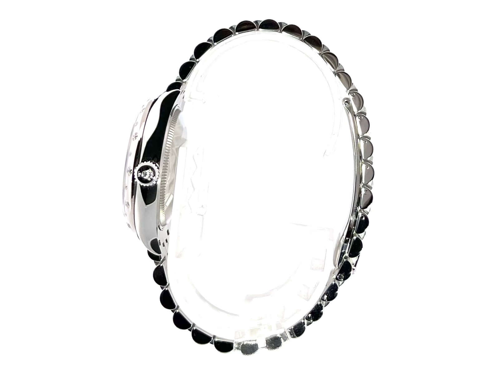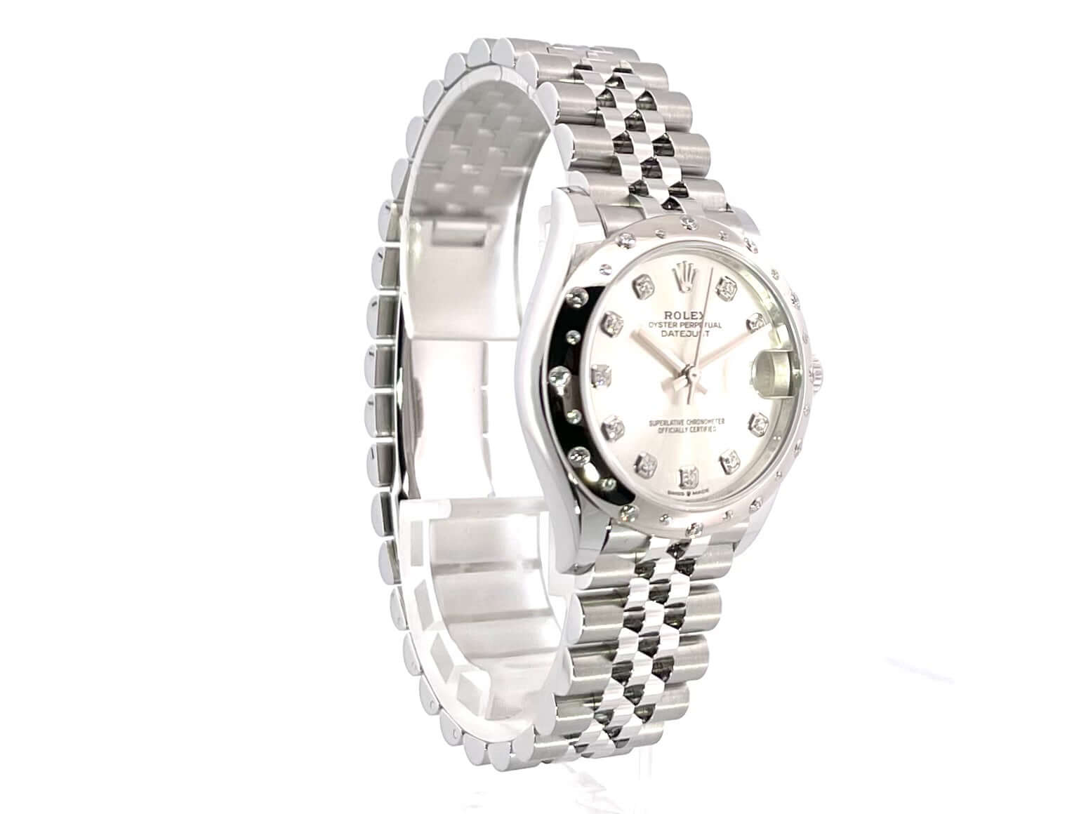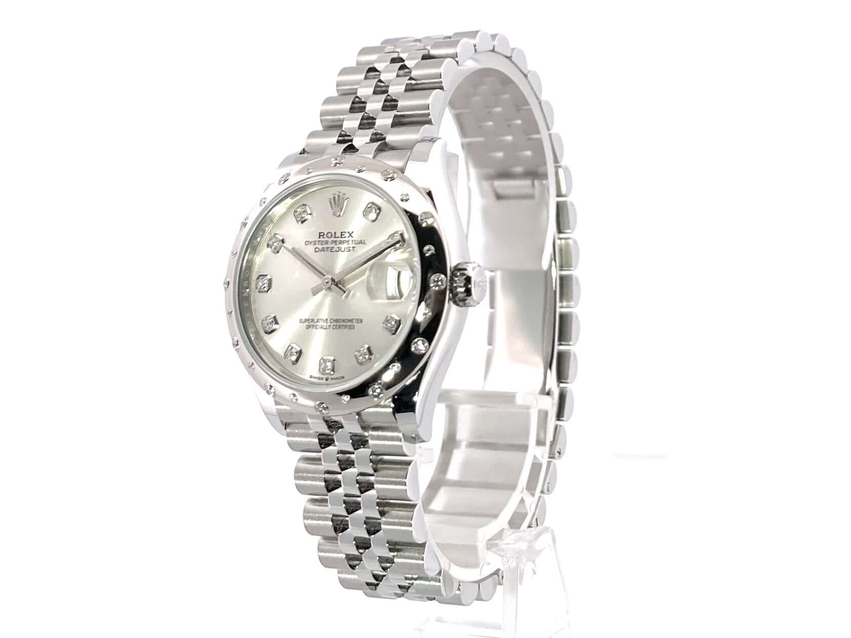 Gehäuse aus Edelstahl poliert und satiniert, Gehäusedurchmesser 31 mm, Lünette aus 18 kt Weißgold mit Diamanten besetzt, Oyster Edelstahl Armband poliert und satiniert mit Faltschließe, silberfarbenes Zifferblatt mit Diamanten besetzt, Automatik, Rolex Manufakturkaliber 2236, 55 Stunden Gangreserve, Datum, Chronometer, Saphirglas, Krone verschraubt, Edelstahlboden verschraubt, Wasserdicht bis 10 bar.