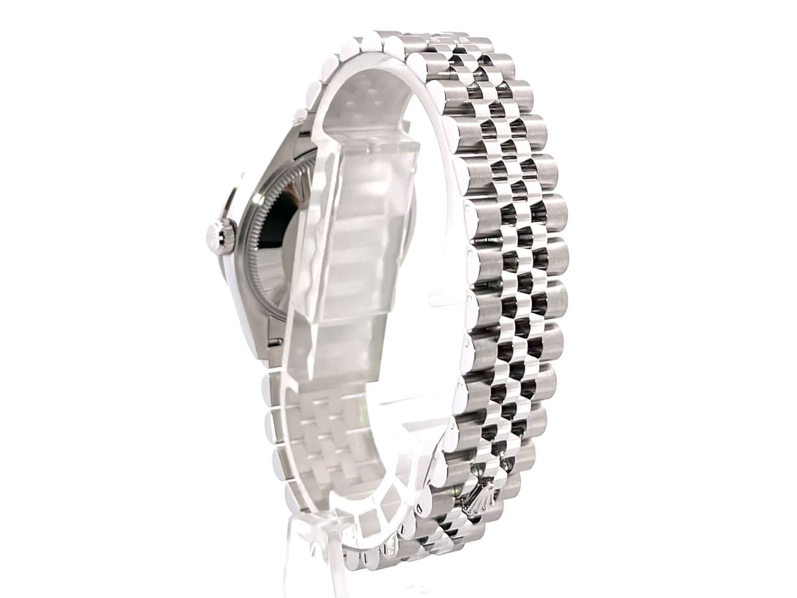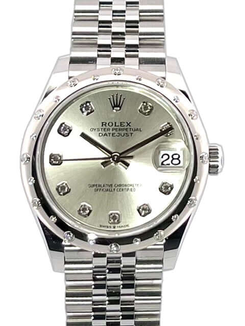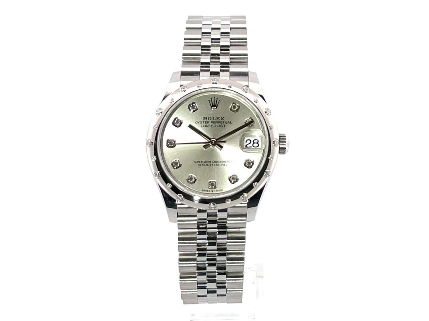 Gehäuse aus Edelstahl poliert und satiniert, Gehäusedurchmesser 31 mm, Lünette aus 18 kt Weißgold mit Diamanten besetzt, Oyster Edelstahl Armband poliert und satiniert mit Faltschließe, silberfarbenes Zifferblatt mit Diamanten besetzt, Automatik, Rolex Manufakturkaliber 2236, 55 Stunden Gangreserve, Datum, Chronometer, Saphirglas, Krone verschraubt, Edelstahlboden verschraubt, Wasserdicht bis 10 bar.