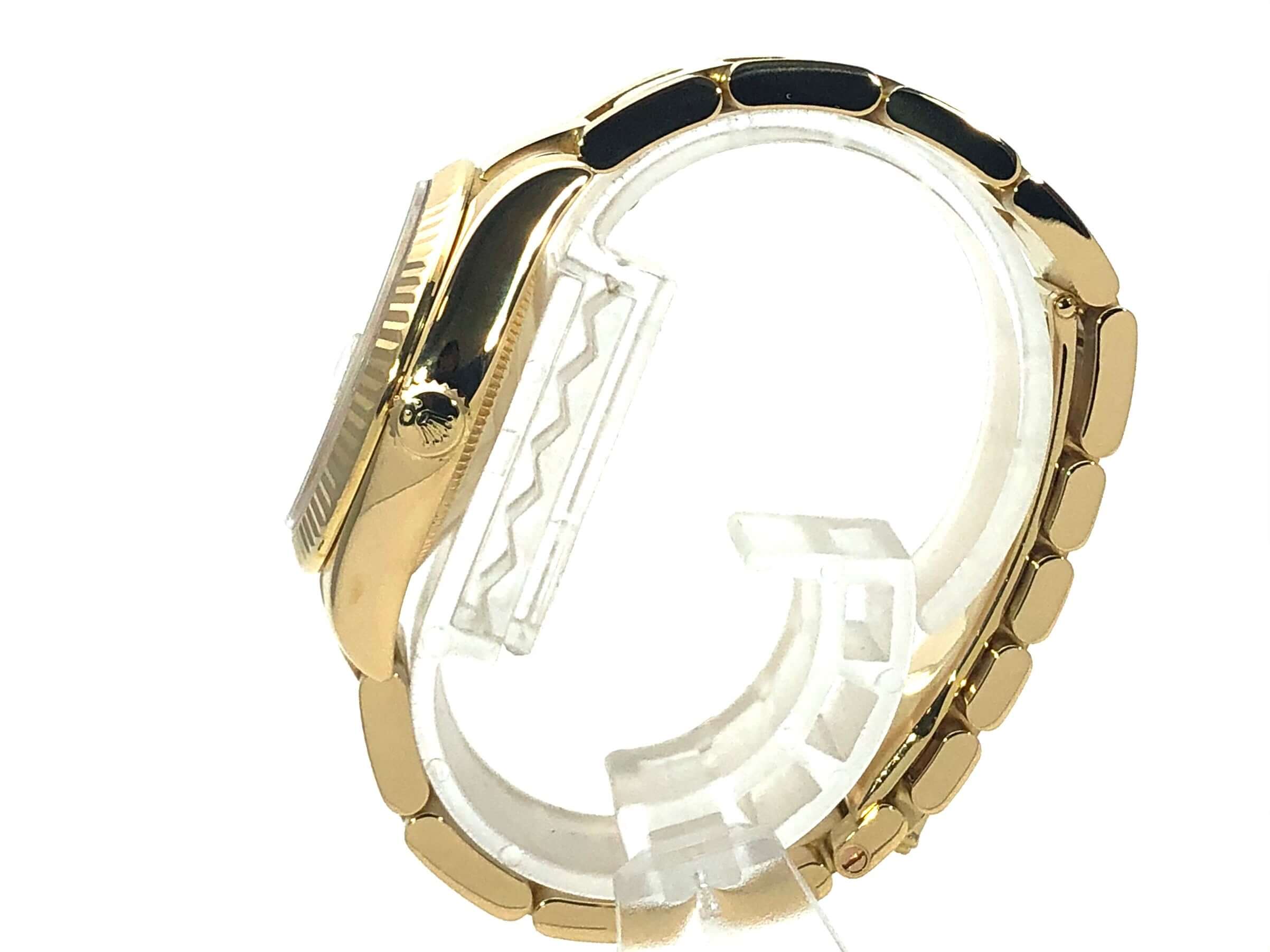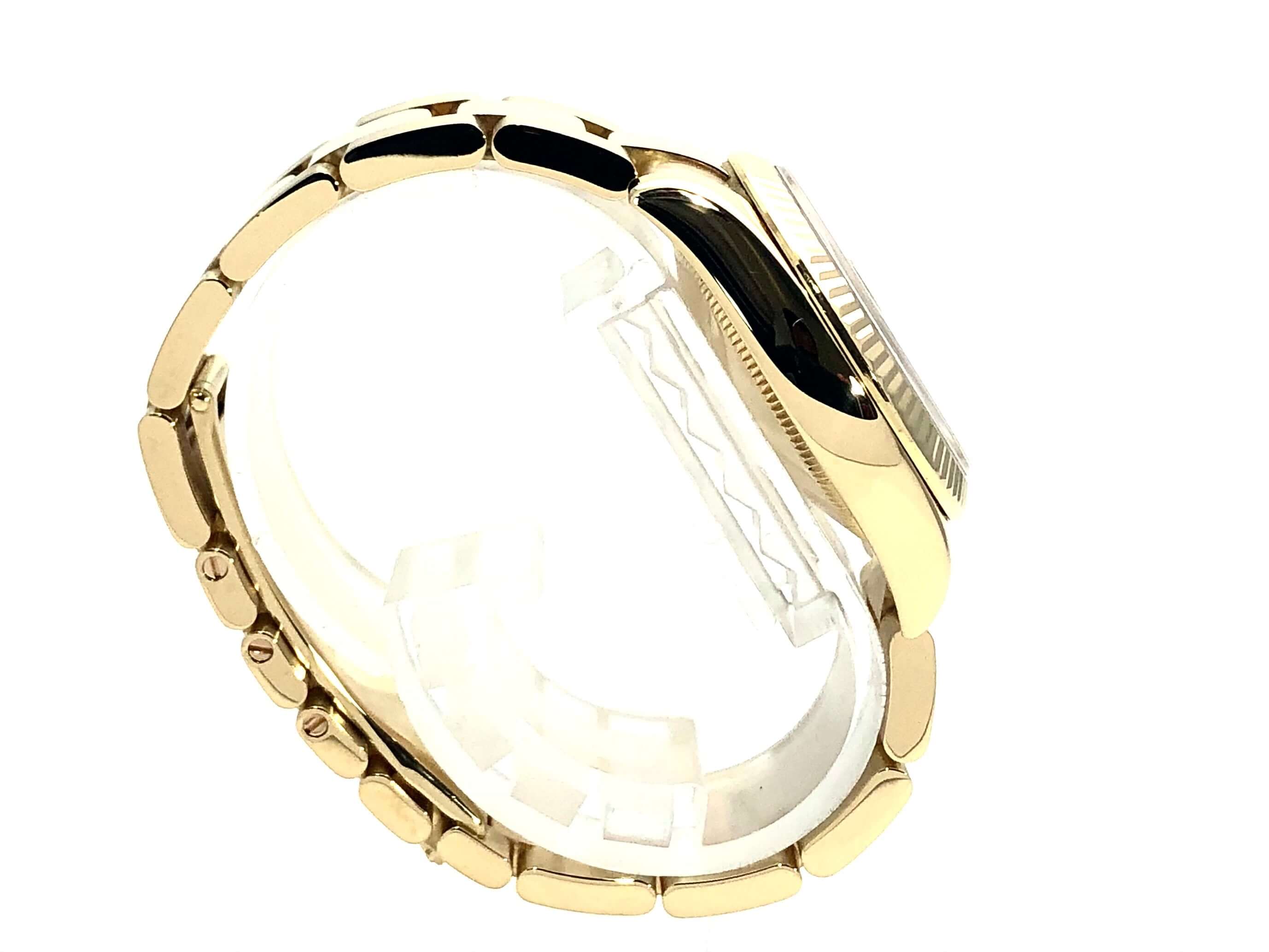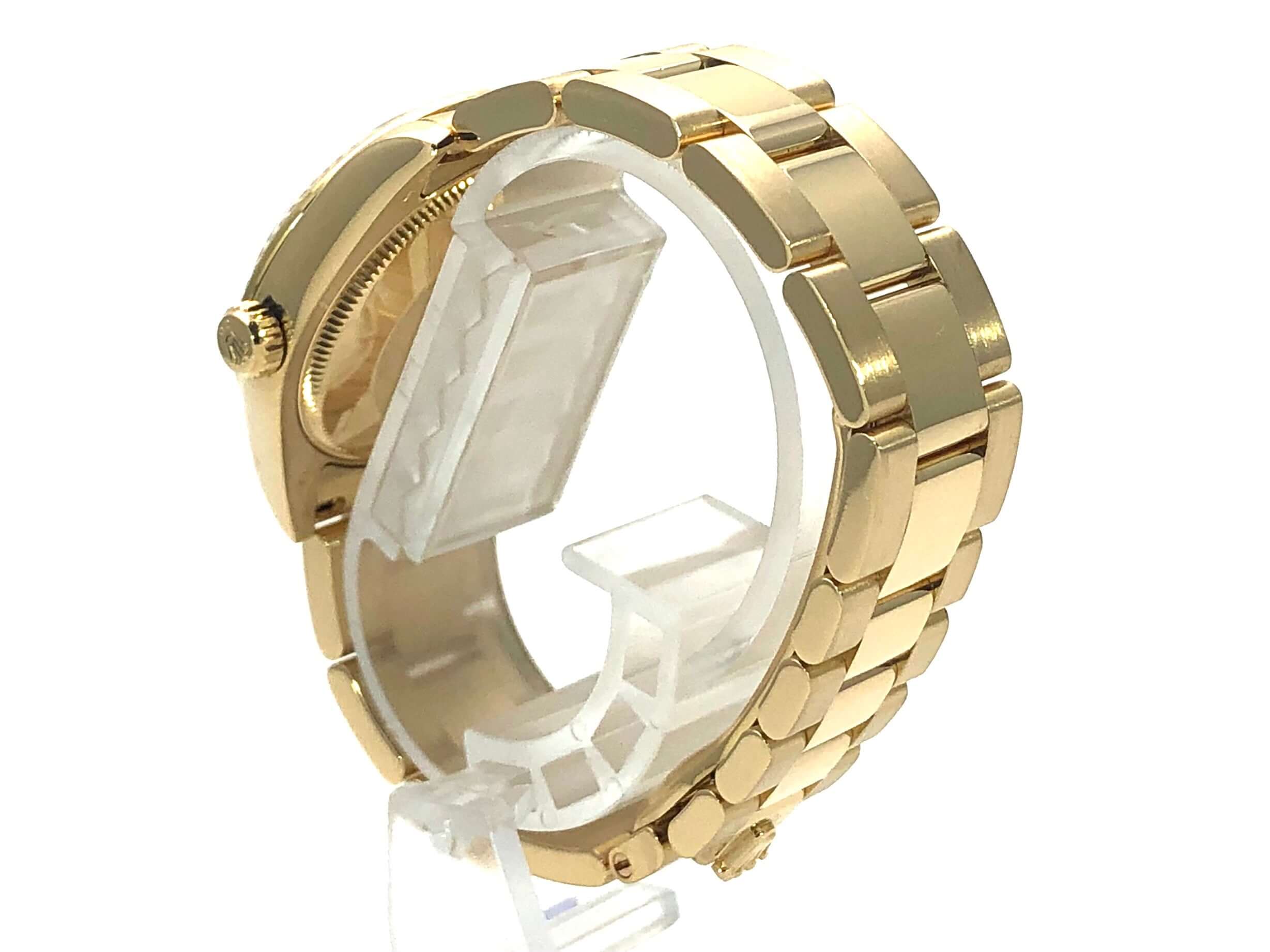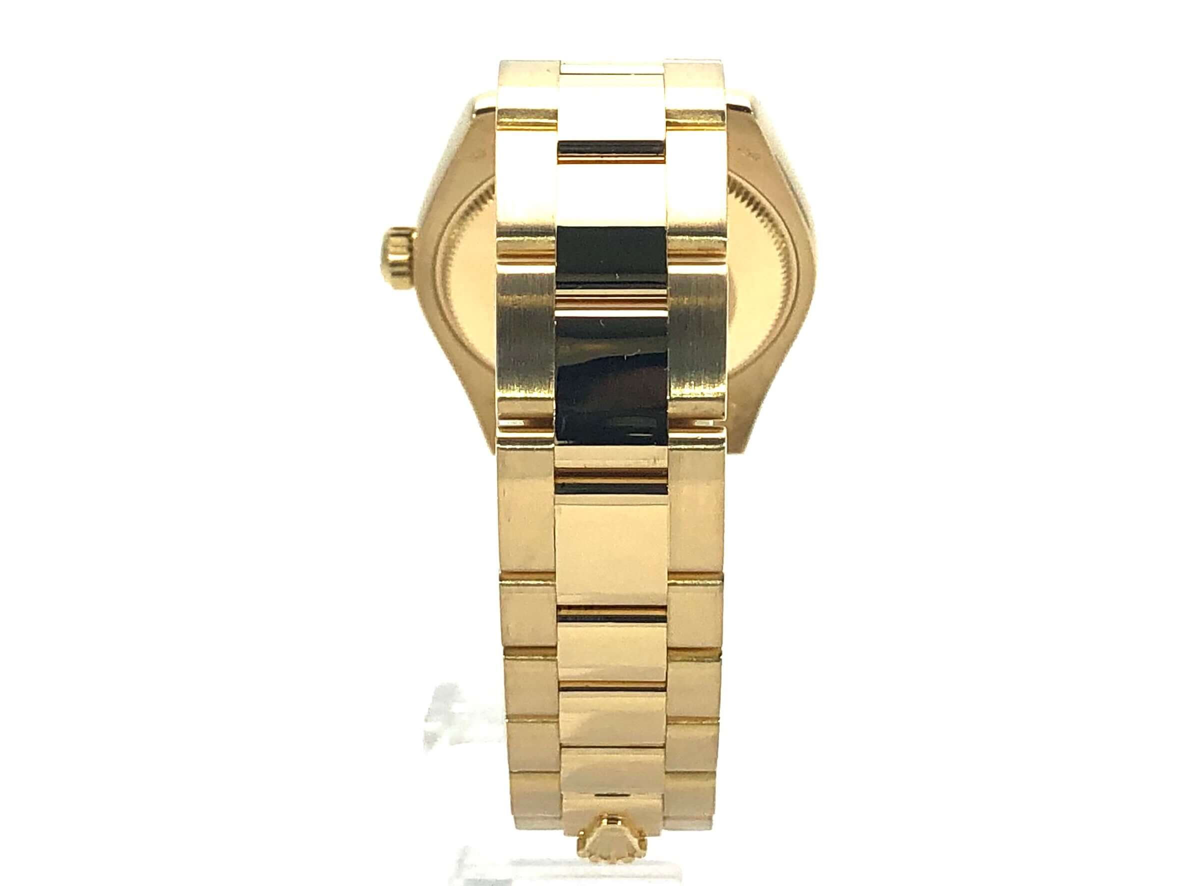 Gehäuse aus Gelbgold poliert und satiniert, Gehäusedurchmesser 31 mm, geriffelte Lünette aus 18 kt Gelbgold, Oyster 18 kt Gelbgold Armband poliert und satiniert mit Faltschließe, weißes Zifferblatt mit aufgesetzten goldenen römischen Ziffern, goldene Zeiger, Automatikwerk, Chronometer, Rolex Manufakturkaliber 2235 mit 31 Steine, 28.800 A/h, Datumsanzeige, kratzfestes Saphirglas, verschraubte Krone aus 18 kt Gelbgold, Gelbgoldboden verschraubt, Wasserdicht bis zu 10 bar.