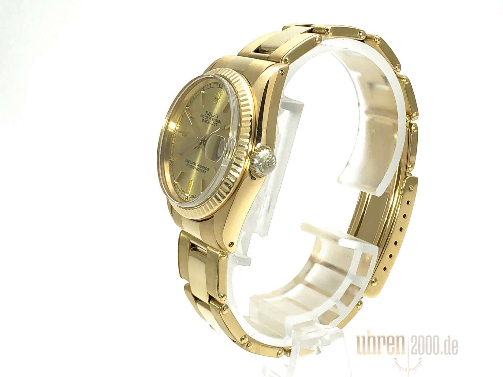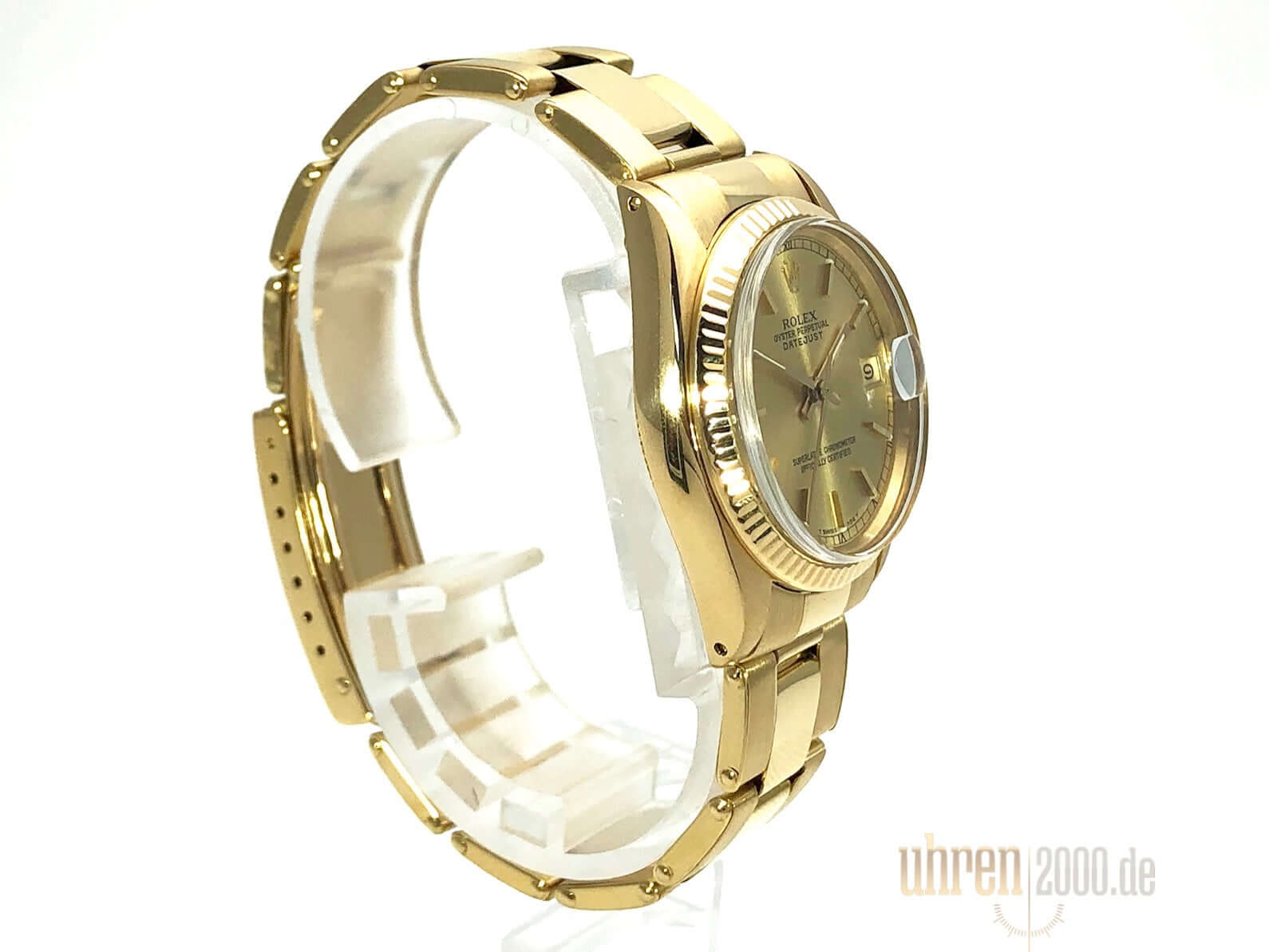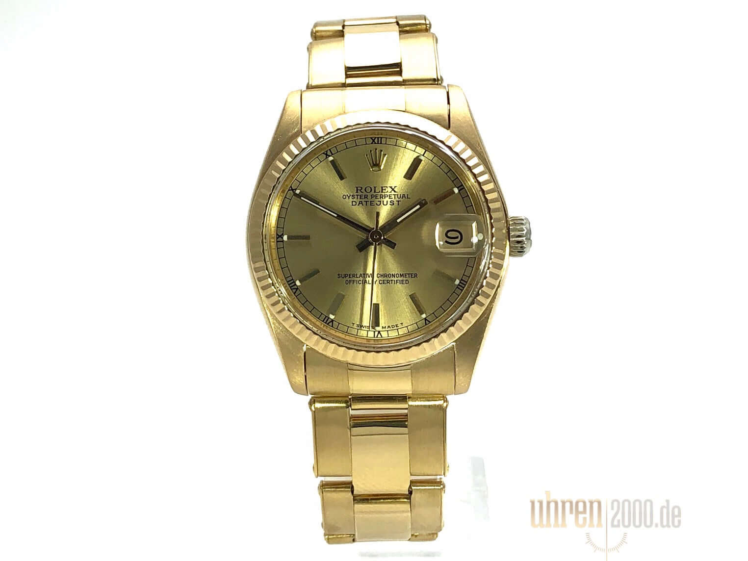 Gehäuse aus Gelbgold poliert und satiniert, Gehäusedurchmesser 31 mm, geriffelte Lünette aus Gelbgold, Gelbgold Band poliert und satiniert mit Faltschließe, Champagner Zifferblatt, goldene Zeiger, Automatikwerk, Datum, Plexiglas, verschraubter Boden aus Gelbgold, Wasserdicht bis zu 10 bar.